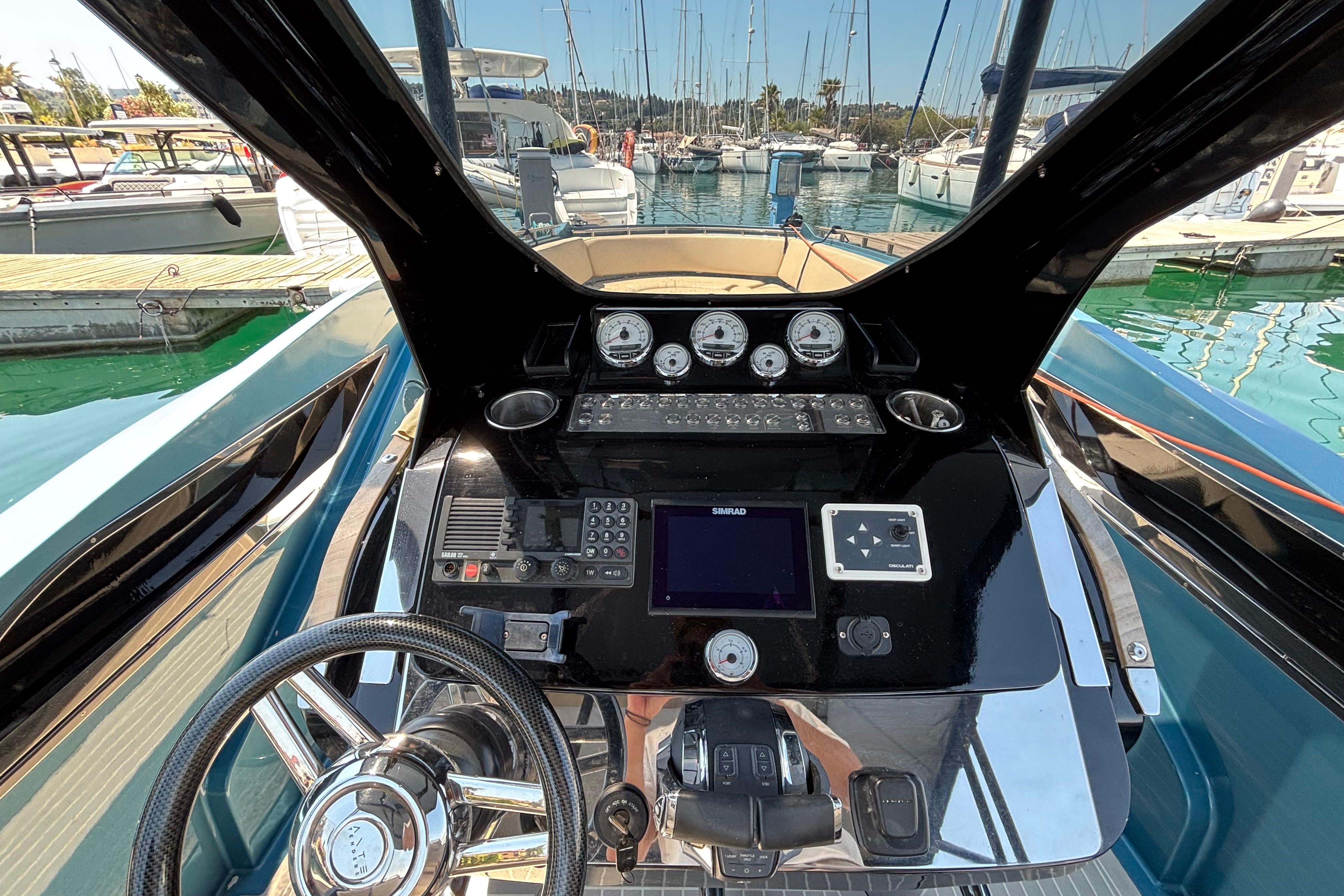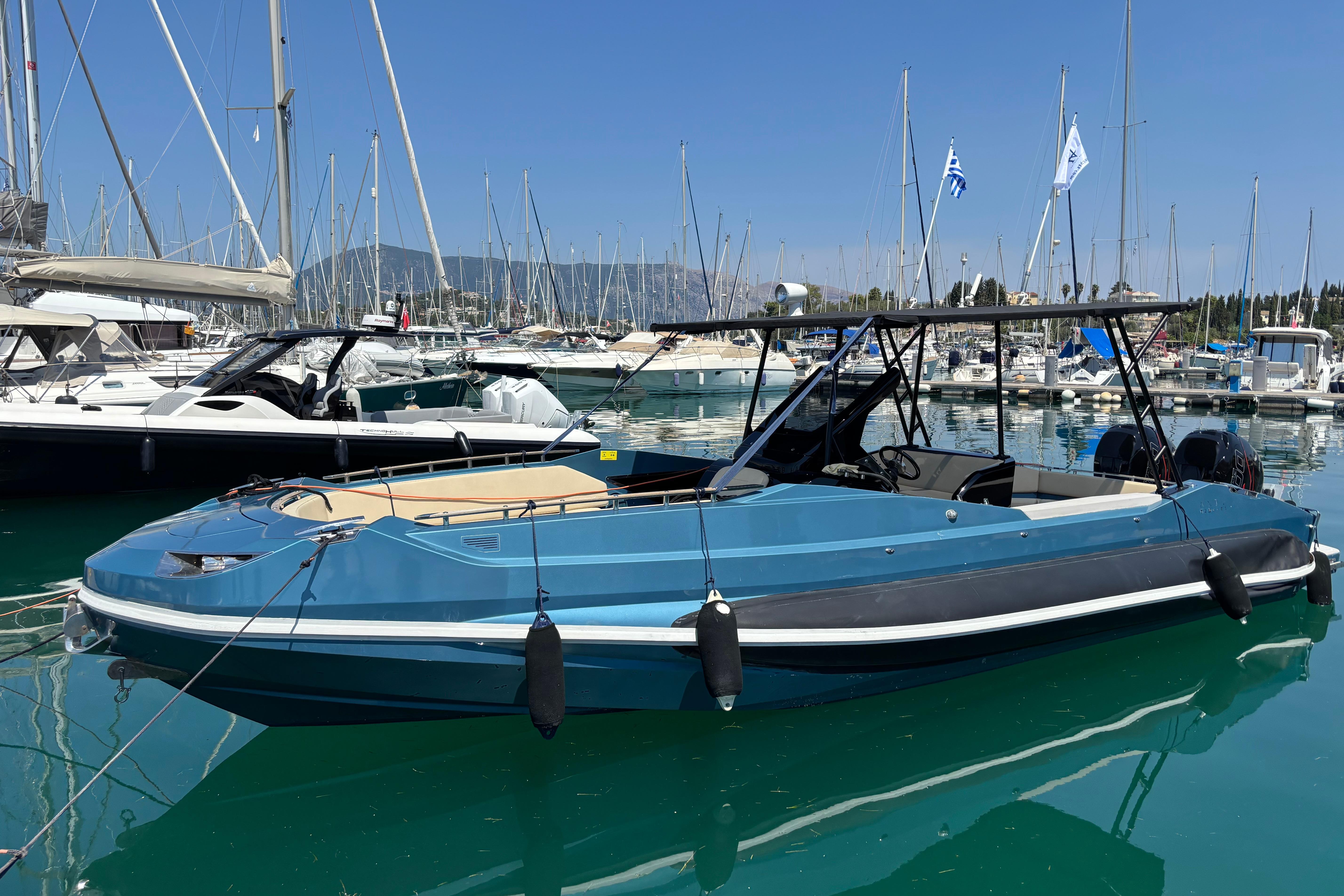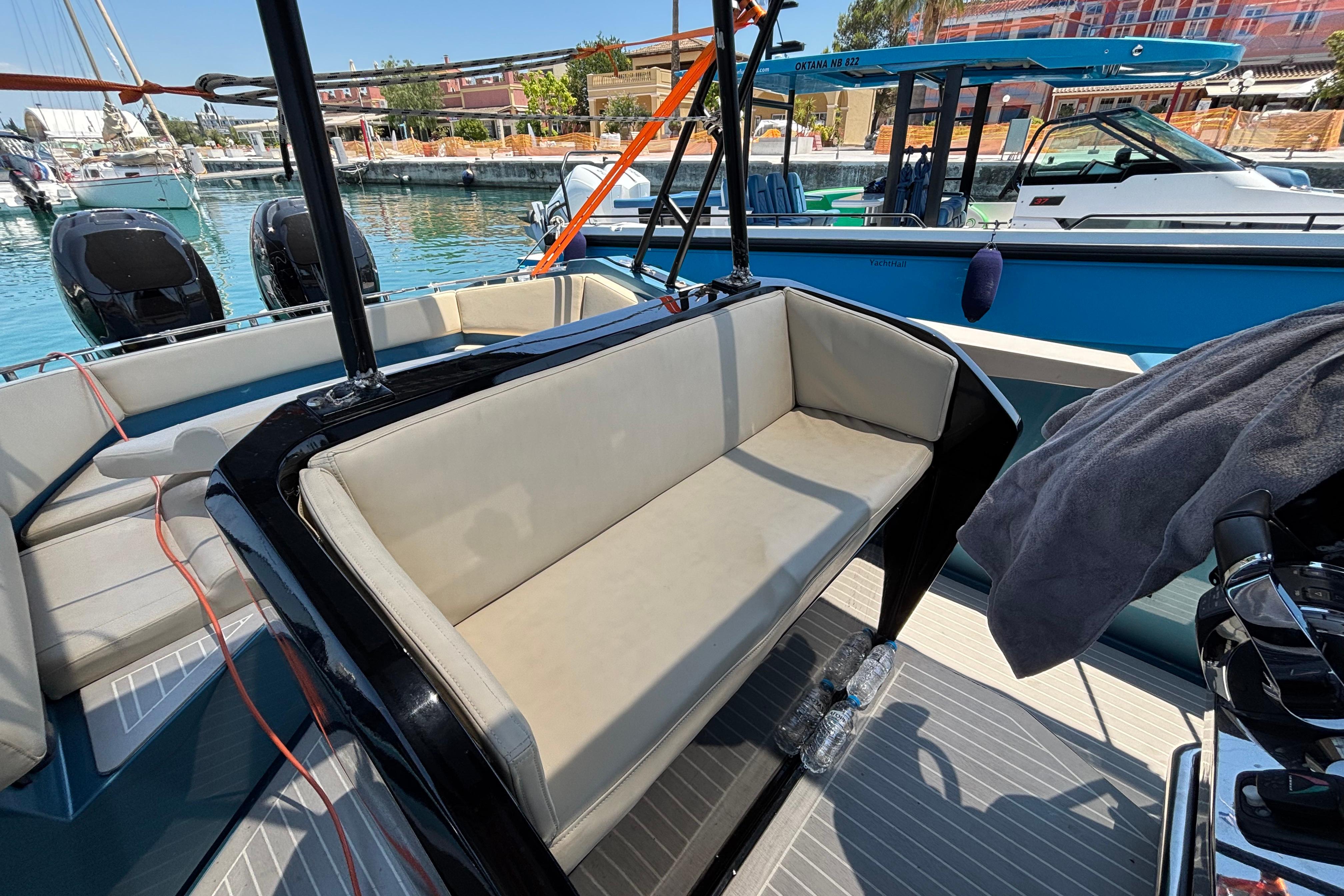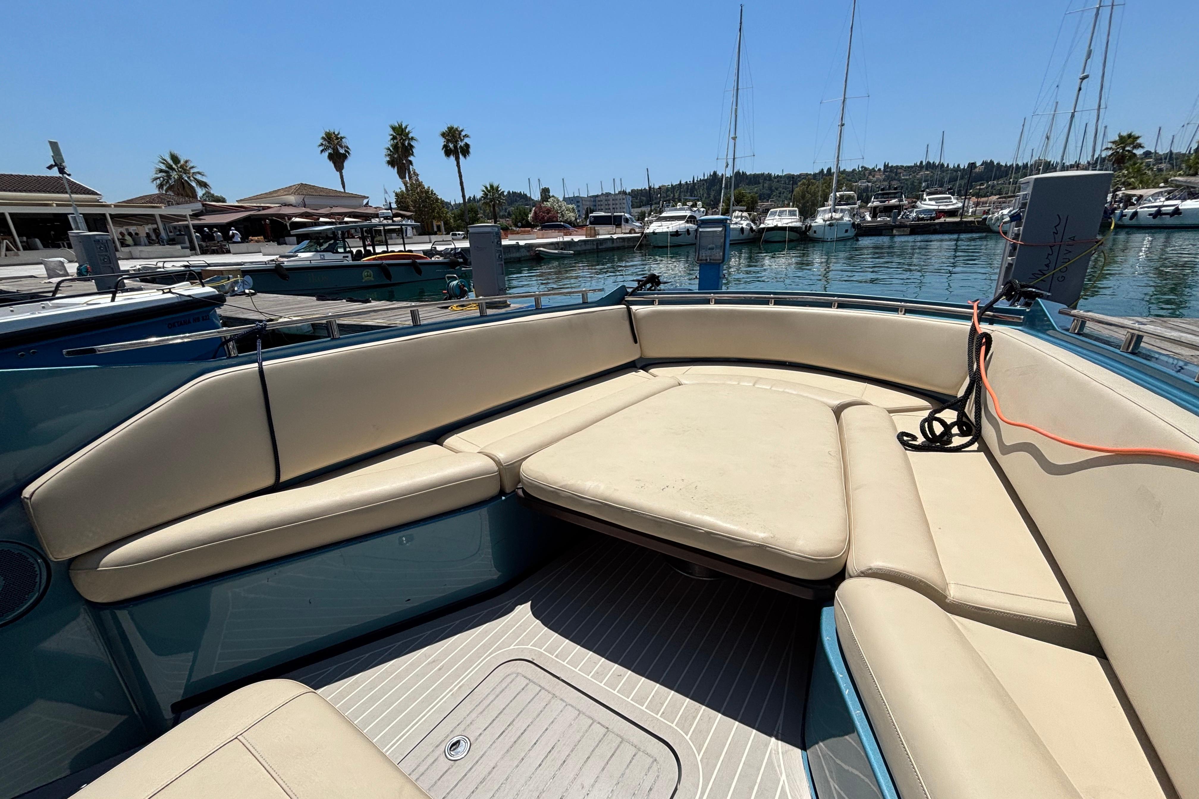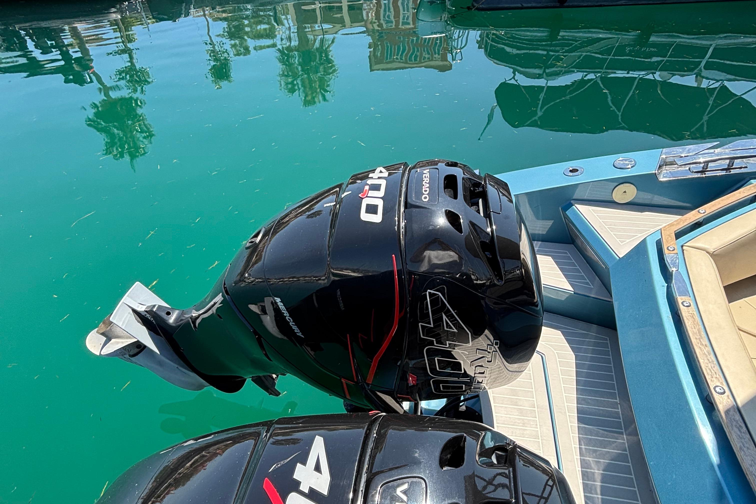 The boat is equipped with two Mercury 400 Racing engines, each delivering 400 horsepower, providing a smooth cruising speed of around 32 knots.