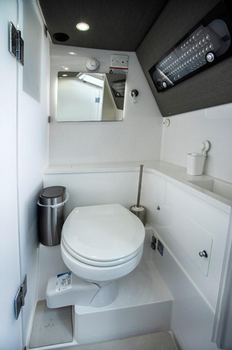 Built-in electric flush toilet under L-sofa w. septic tank 70l and deck/hull outlets