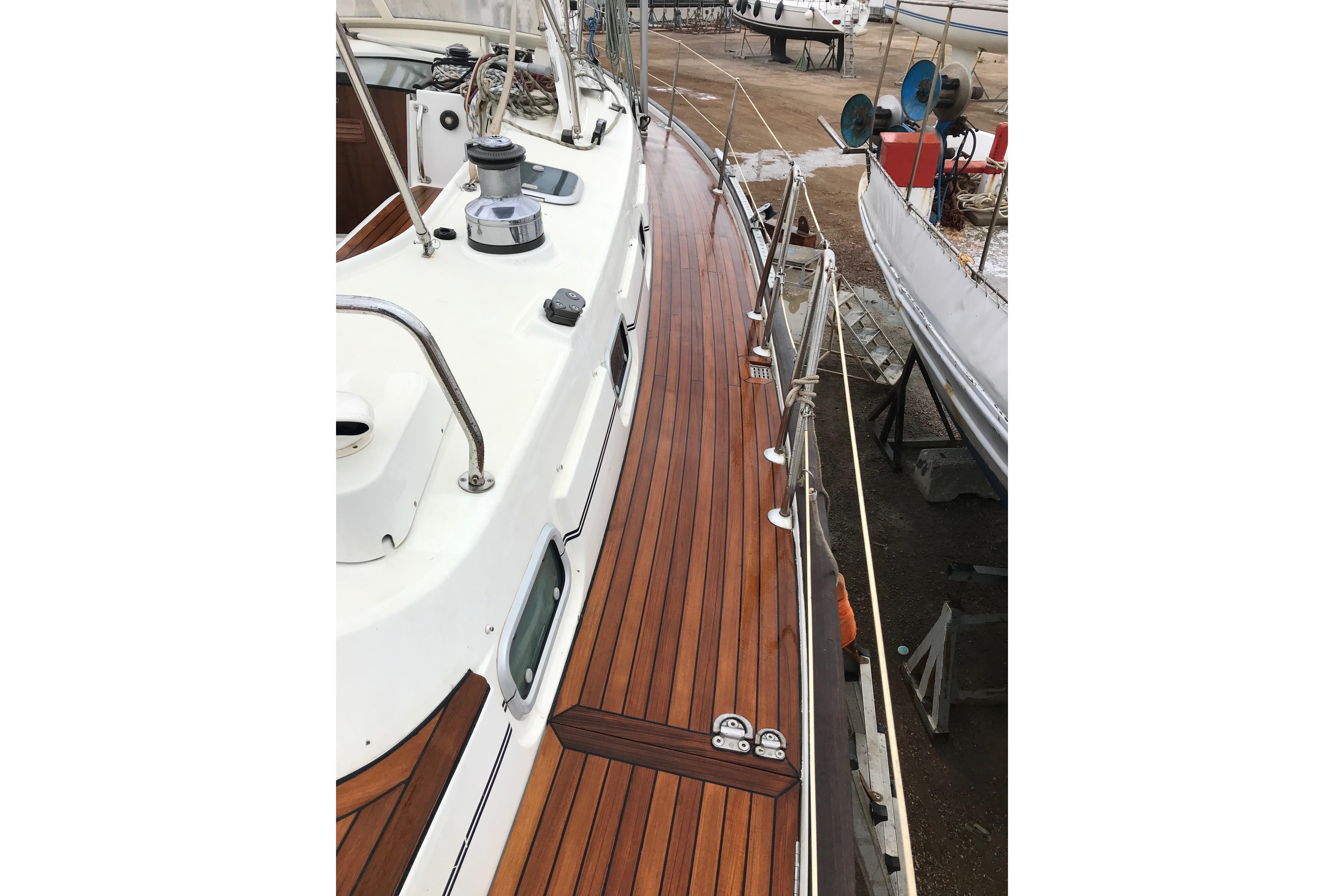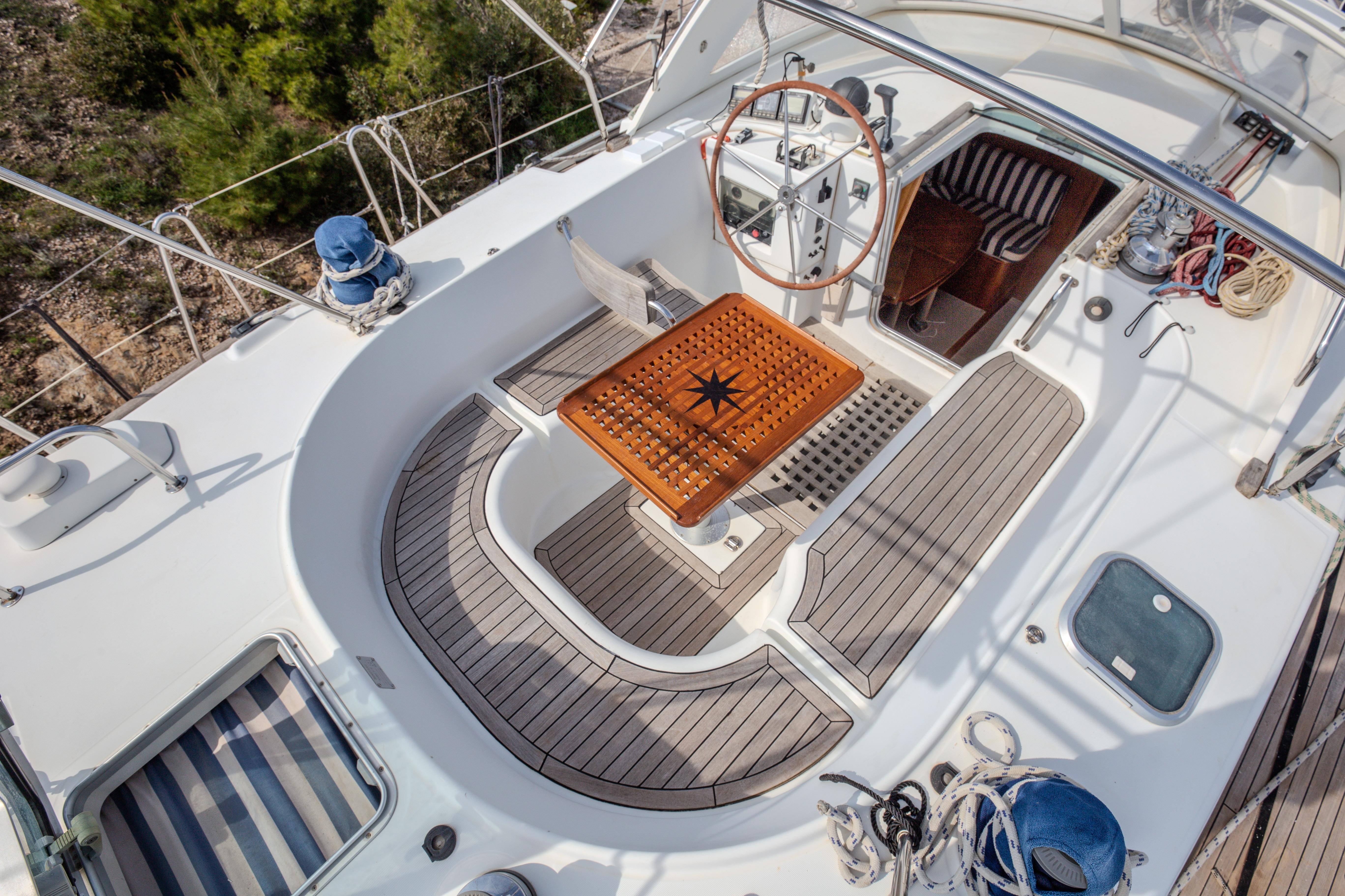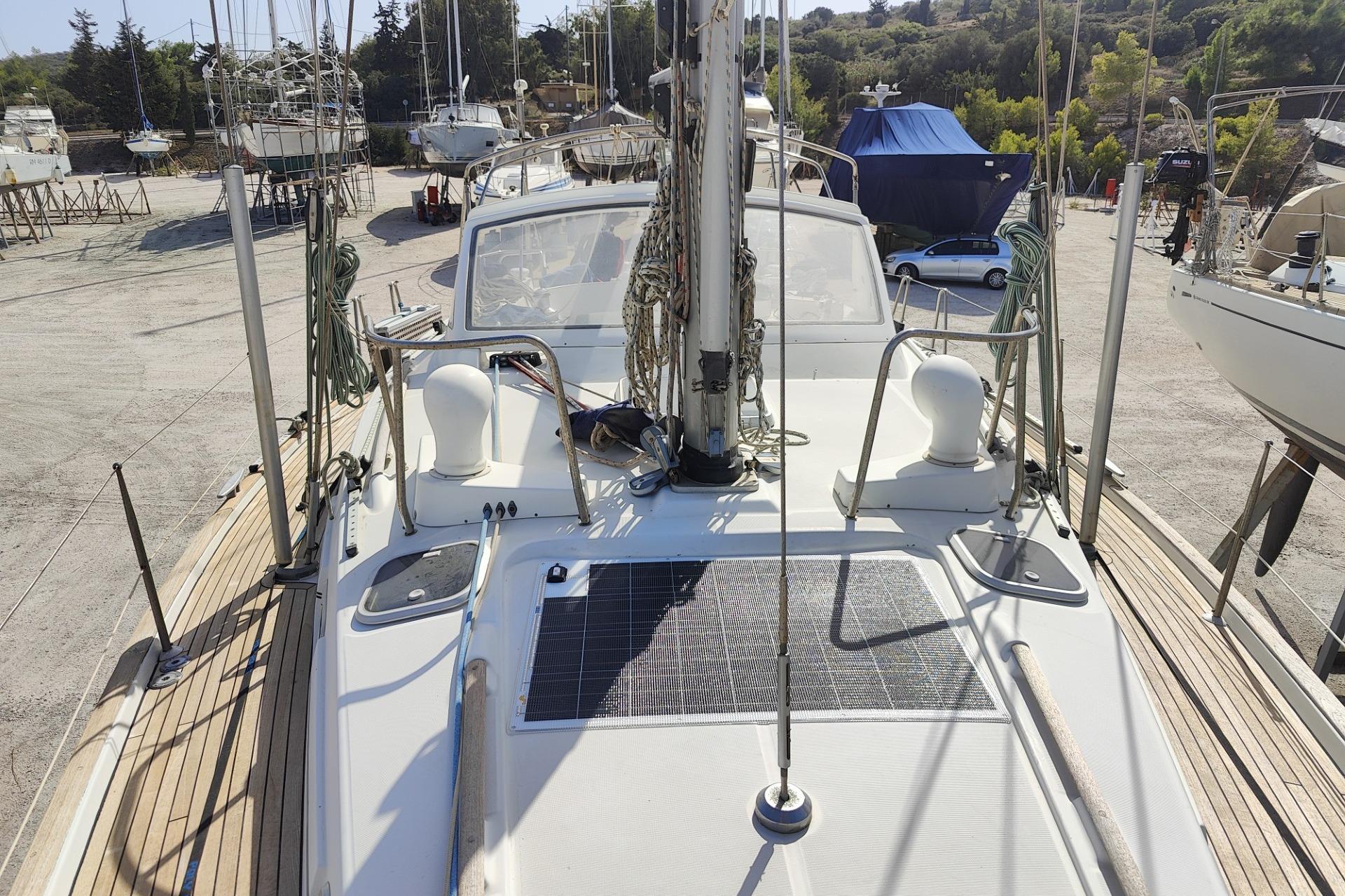 The cutter rig stands out for its versatility and ease. As her previous owner often described, even in the full force of a Meltemi (Mistral) in the Aegean, the boat maintained impressive speed and balance with almost no trimming required. Once the sails were set—frequently relying on the staysail for drive—the autopilot handled the majority of the passage, leaving only occasional light touches on helm or sheets. Complementing this is the wing keel, drawn from America’s Cup origins and widely emulated in production yachts, which provides excellent directional stability, minimal leeway, a light helm and reduced steering effort—ideal for extended short-handed or autopilot-driven cruising.