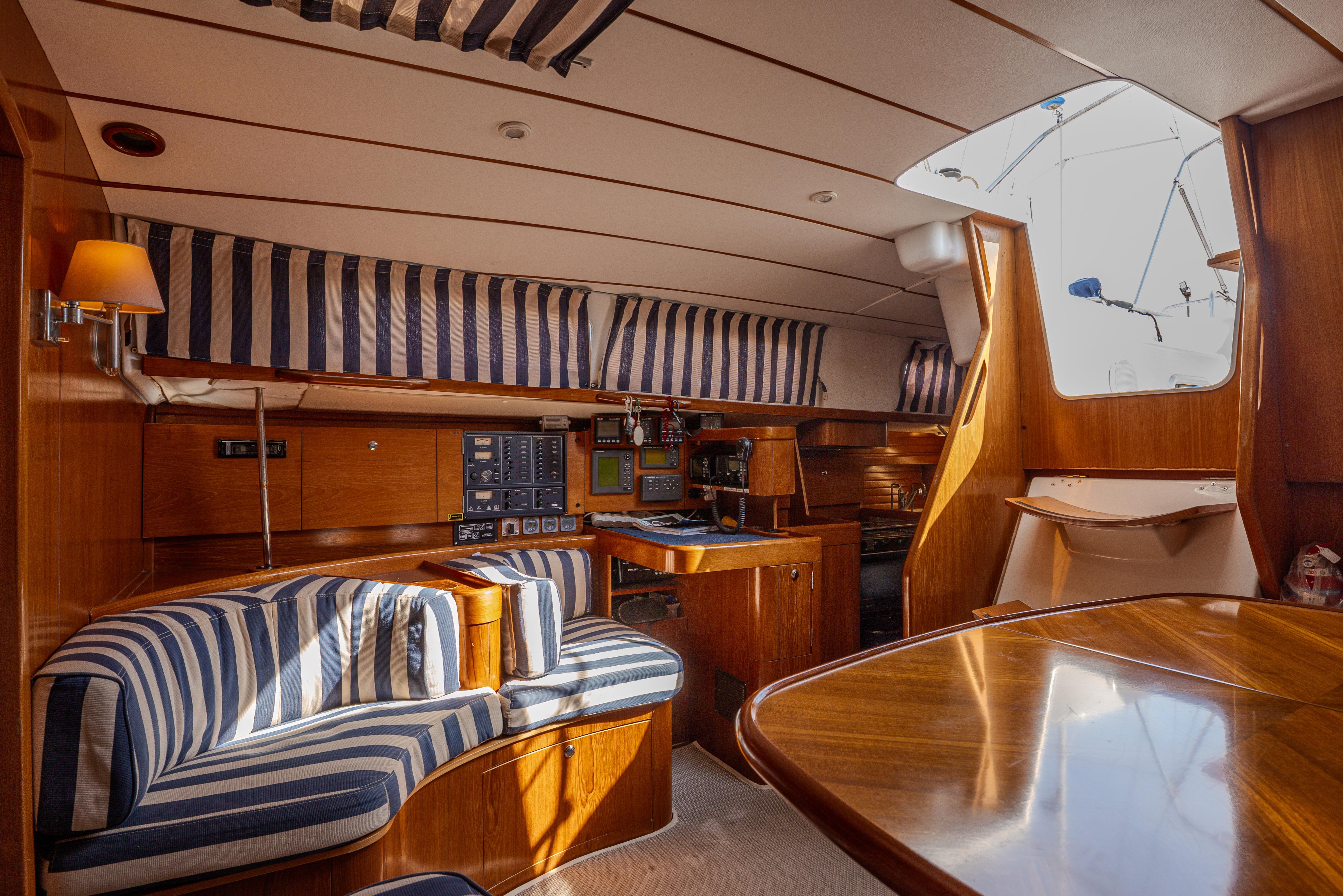 Maneuvering under power is equally straightforward: electric winches handle the large genoa, mainsail and in-mast reefing without physical strain, while the bow thruster and remote controls for both thruster and windlass make berthing and anchoring in confined spaces far less demanding. These elements combine to remove much of the effort from sailing, letting the crew concentrate on the passage itself.