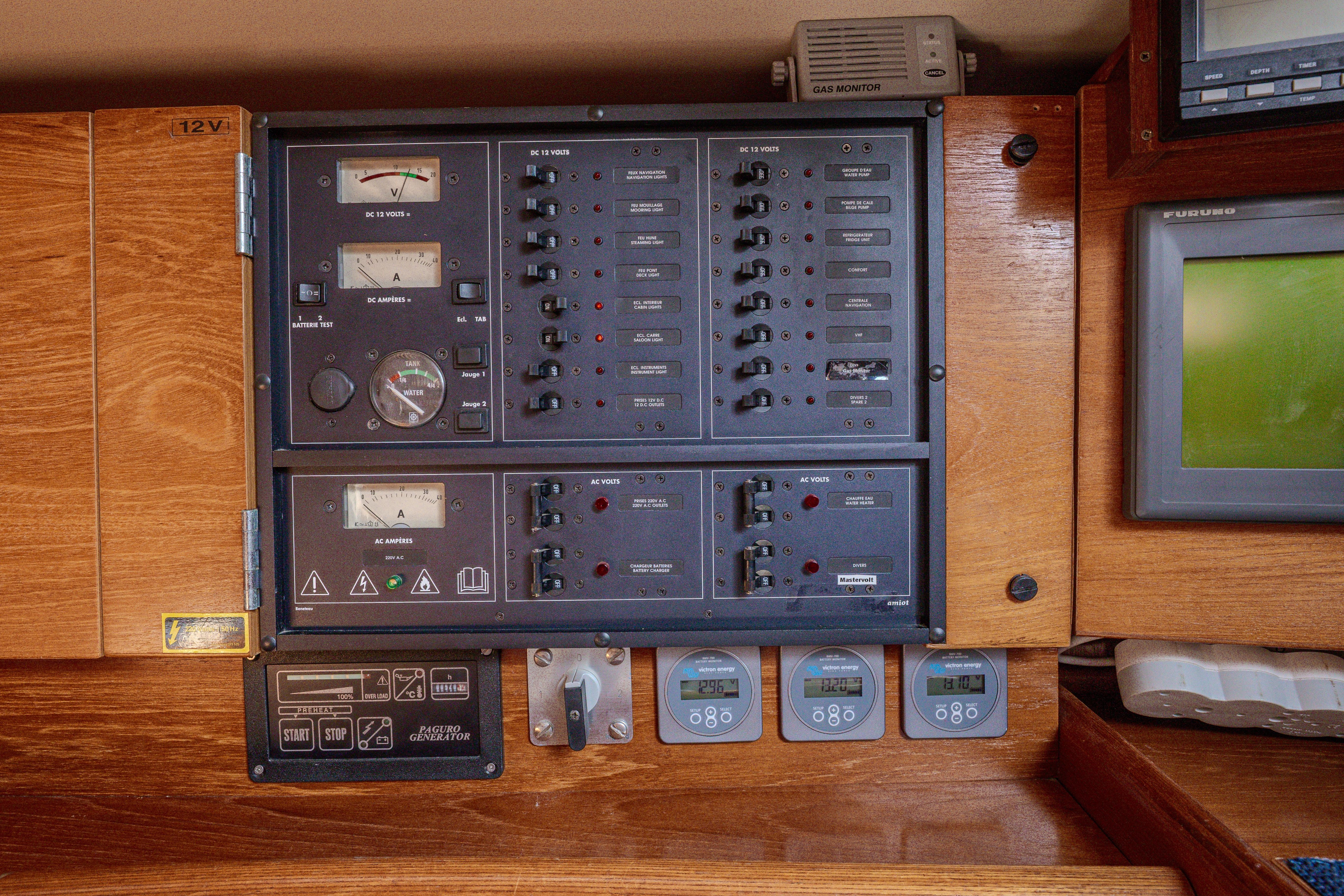 DC circuit system and distribution panel power internal lighting, instruments, fresh water and bilge pumps.