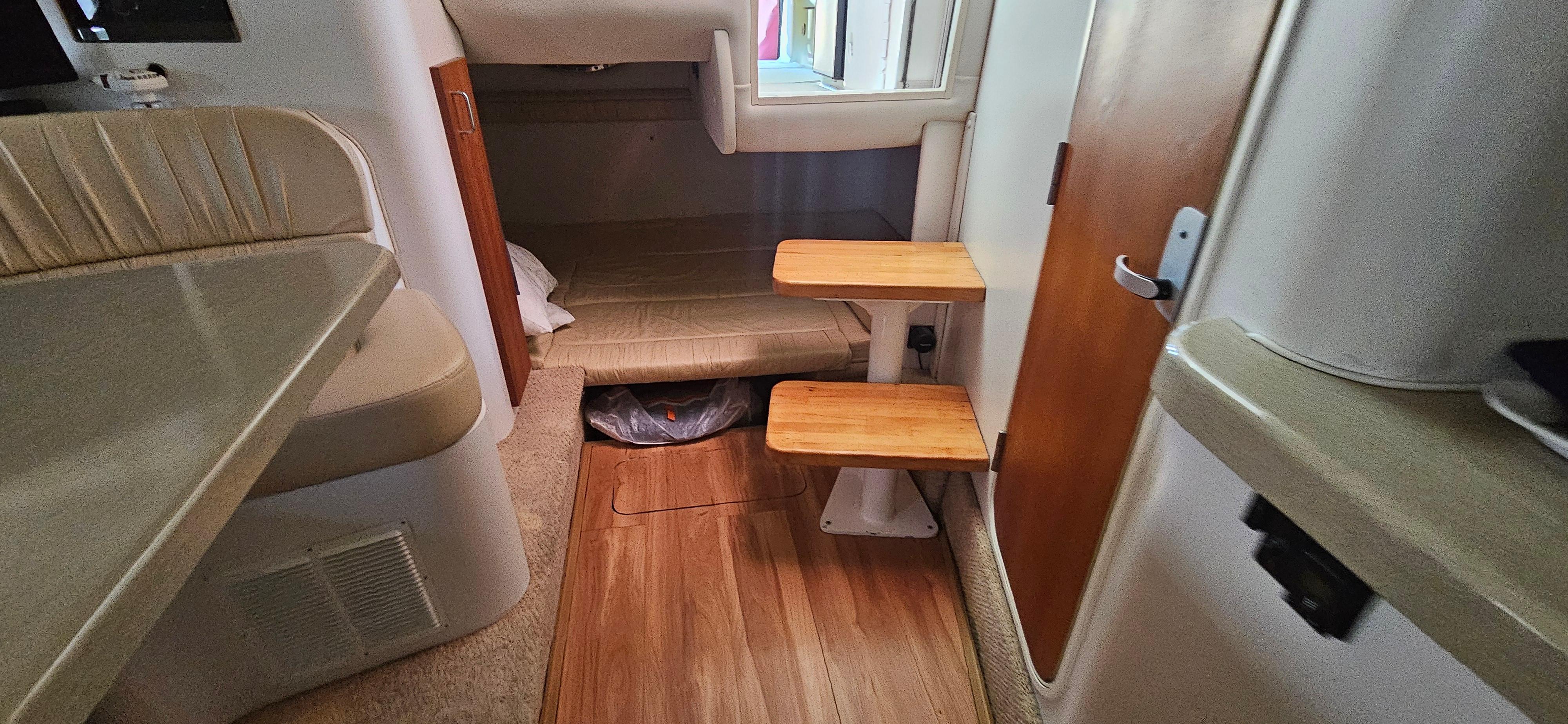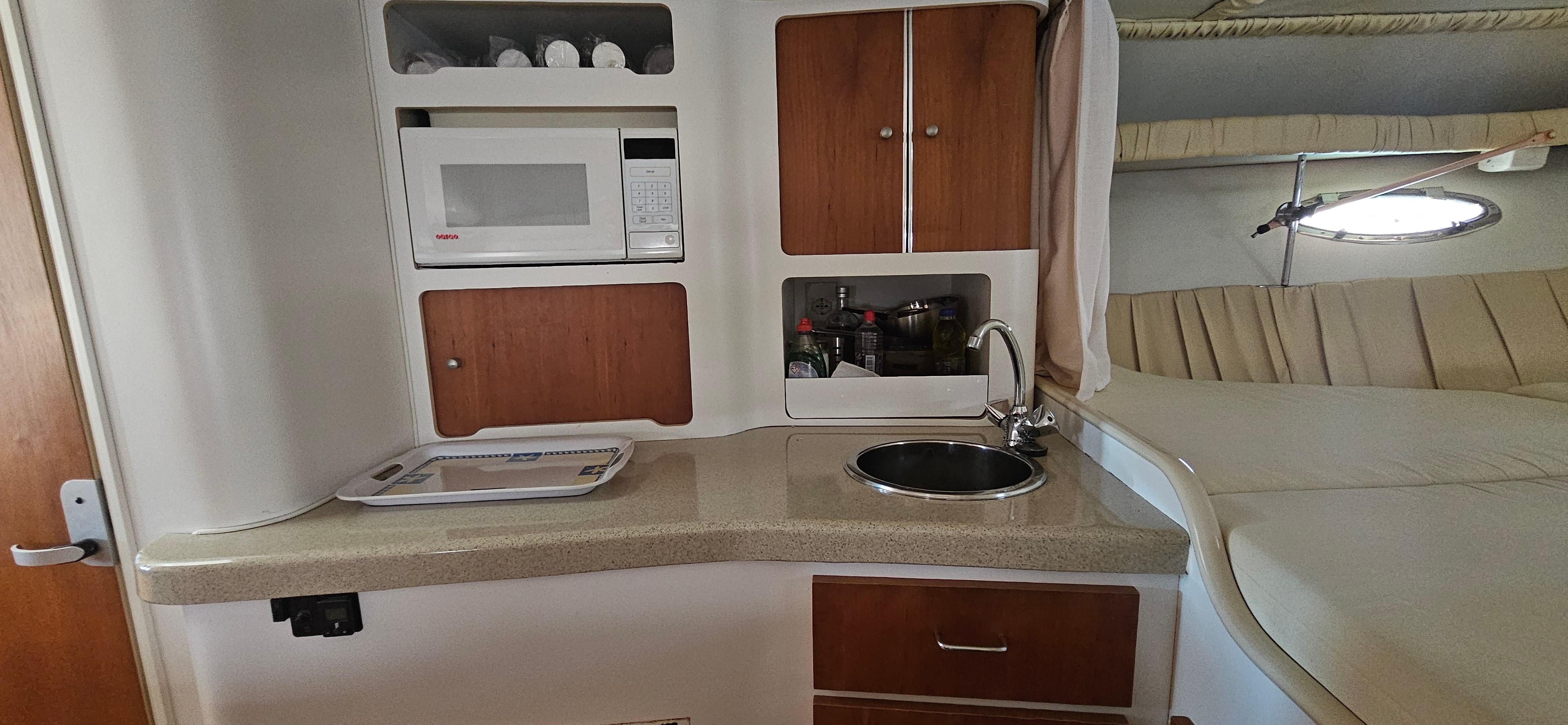 Chris-Craft 308 Express Cruiser Specifications - Standard Equipment - Bimini top with colorfast acrylic fabric - Clarion Marine AM-FM stereo CD with 4 speakers and helm remote - Cockpit courtesy lighting - Cockpit wetbar with stainless sink and faucet - Concealed anchoring system with anchor roller, cleat & hawse pipe - Curved glass wrap-around windshield - Drink holders - Fiberglass cockpit liner with non-skid finish - Full swim platform with concealed boarding ladder - Hydraulic trim tabs - Pressure water system - Removable Berber cockpit carpet - Sculpted 40 oz. vinyl cockpit upholstery - Seating: dual helm flip-up seat with U-shaped aft seating, portside companion seat; portside bench seat - Shore water connection - Translucent sliding cabin door with screen - Transom door - Transom shower - Transom storage box - White translucent deck hatches with screens (3) Helm - Compass - Engine safety shutoff switch with belt clip - High-visibility engine instrumentation: tachometer, engine synchronizer gauge, oil pressure, temperature, hour meters, trim indicators, trim tabs indicators, fuel gauges - Illuminated switches - In-dash LCD digital depth finder - Mahogany grain dash panels - Power steering - Tilt steering wheel Electrical - 110V AC duplex outlets with GFI protection - 110V - 12V distribution panel with circuit breakers - Battery charger - Dual battery system with battery isolator - Shorepower with 50 ft. cord - Water heater (6 gallon) - Windshield wiper Standard Interior - Cabin carpet - Pillow set (3) Forward Cabin - Carbon monoxide detector - Double berth with storage underneath - Opening portlights - Privacy curtain - Reading lights - Storage cabinets & shelves Main Cabin - Convertible dinette - Hanging locker - Opening portlights - Overhead lighting Midcabin - Double berth - Opening portholes - Privacy curtain - Reading lights - Storage compartments Galley - AC-DC refrigerator - Coffee maker - Granulon countertops, sink with cutting board - Microwave oven - Overhead lighting - Single-burner electric stove - Storage cabinets & shelves Head - Molded fiberglass vanity - Opening portlight - Shower curtain - Towel storage - VacuFlush toilet system Chris-Craft 308 Express Cruiser Optional Equipment - Air conditioning - Anchor windlass with remote switches - Bimini enclosure with windshield connector, side and aft curtains - CE Certification - Clarion 6 disc CD changer - Cockpit ice maker - Cockpit carpet, blue - Cockpit carpet, green - Cockpit cover - Cockpit table - Cockpit table filler cushion - Engine room light - Fire extinguisher system, gas - Foredeck sunpad cushion - Fume detector - Generator, 110V 5 kW, gas - Gray water system - Head compartment vent fan - Heat exchanger (water heater) - Oil drip pan - Radar arch - Remote searchlight - Repair kit - TV - VCR with dockside cable - Base white gelcoat with gelcoat accents - Classic graphics: black, burgundy, green, navy - Interior decor: black, blue, green, neutral Power Options - DuoProp with S-S prop - High Altitude Drives (5000 ft. and above) - SX Cobra Drive - Volvo Penta Gi T-7.4L, EFI, 310 PSHP - Volvo Penta GL T-5.0L, 2V, 220 PSHP - Volvo Penta GS T-5.7L, 2V, 250 PSHP - Volvo Penta Gi T-4.3L, EFI, 205 PSHP - Volvo Penta Gi T-5.0L, EFI, 250 PSHP - Volvo Penta Gsi T-5.7L, EFI, 280 PSHP