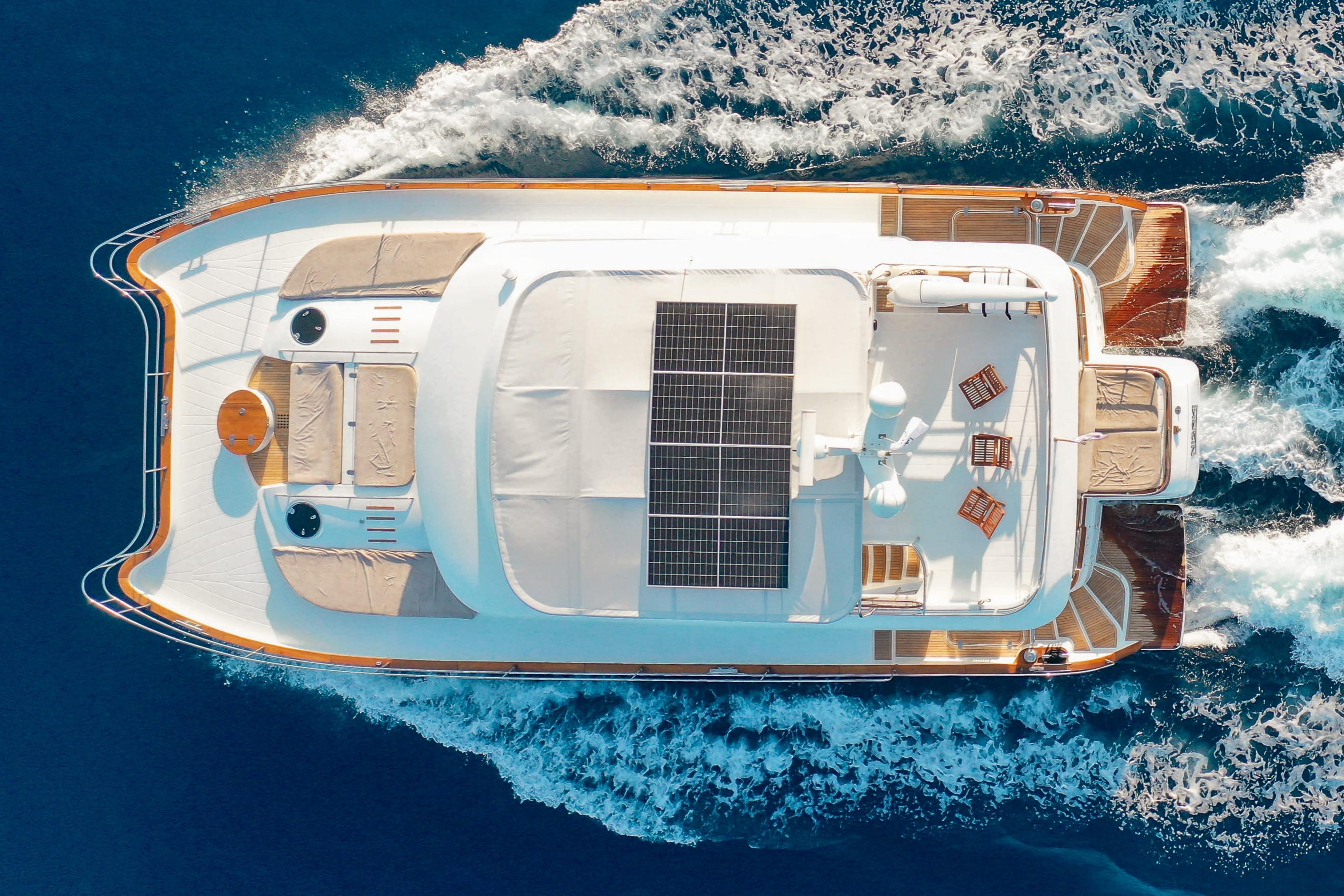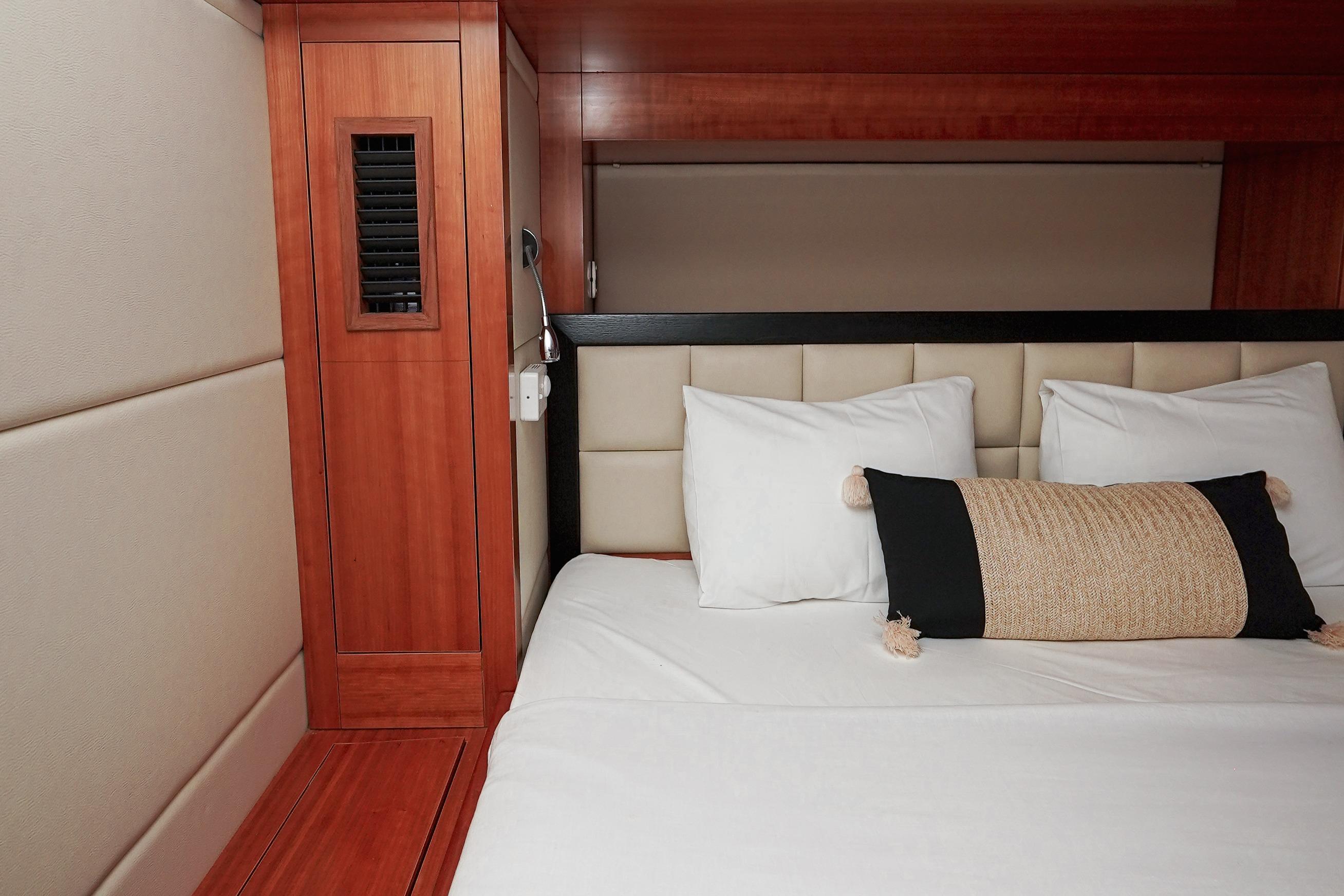 The layout includes four generously sized guest cabins, all with en-suite bathrooms. Crew accommodation is provided via a single cabin with one berth, integrated into the dedicated laundry room, accessible from both the forward guest cabin and an exterior hatch. The main saloon is bright and airy, featuring panoramic windows, a comfortable lounge area, and a fully equipped galley. The flybridge includes helm controls, a wet bar, and spacious lounging and sunbathing areas, ideal for entertaining or extended cruising.