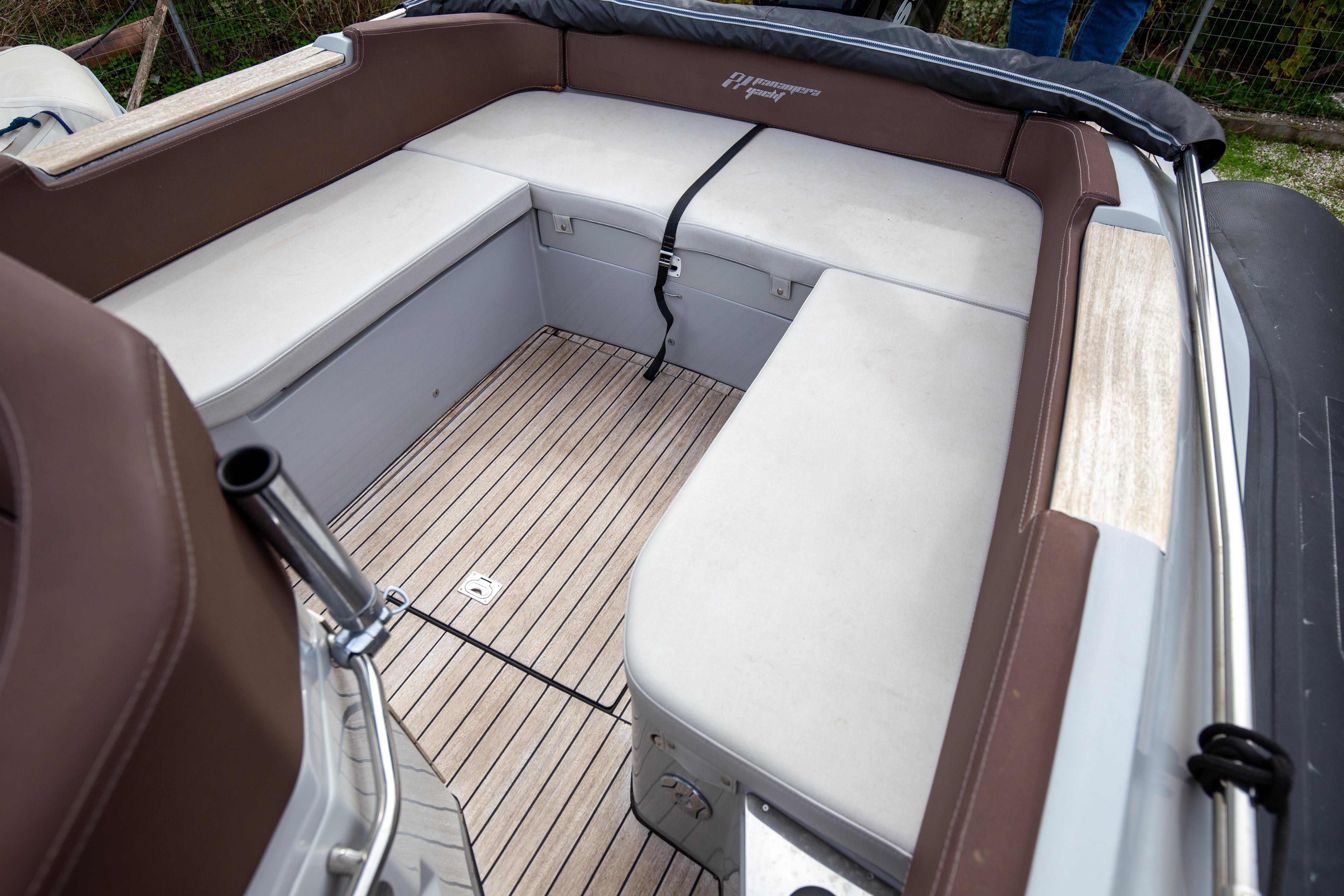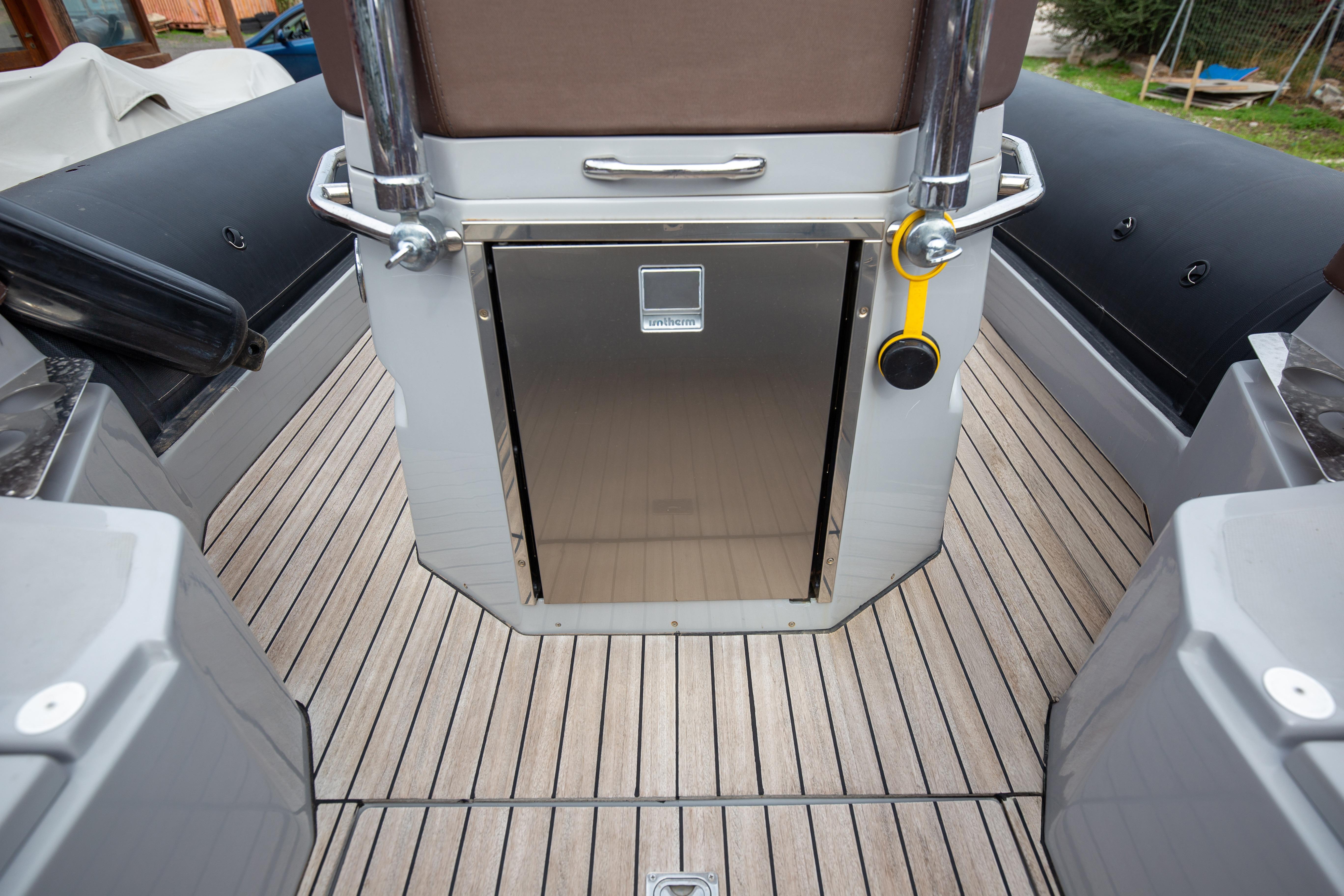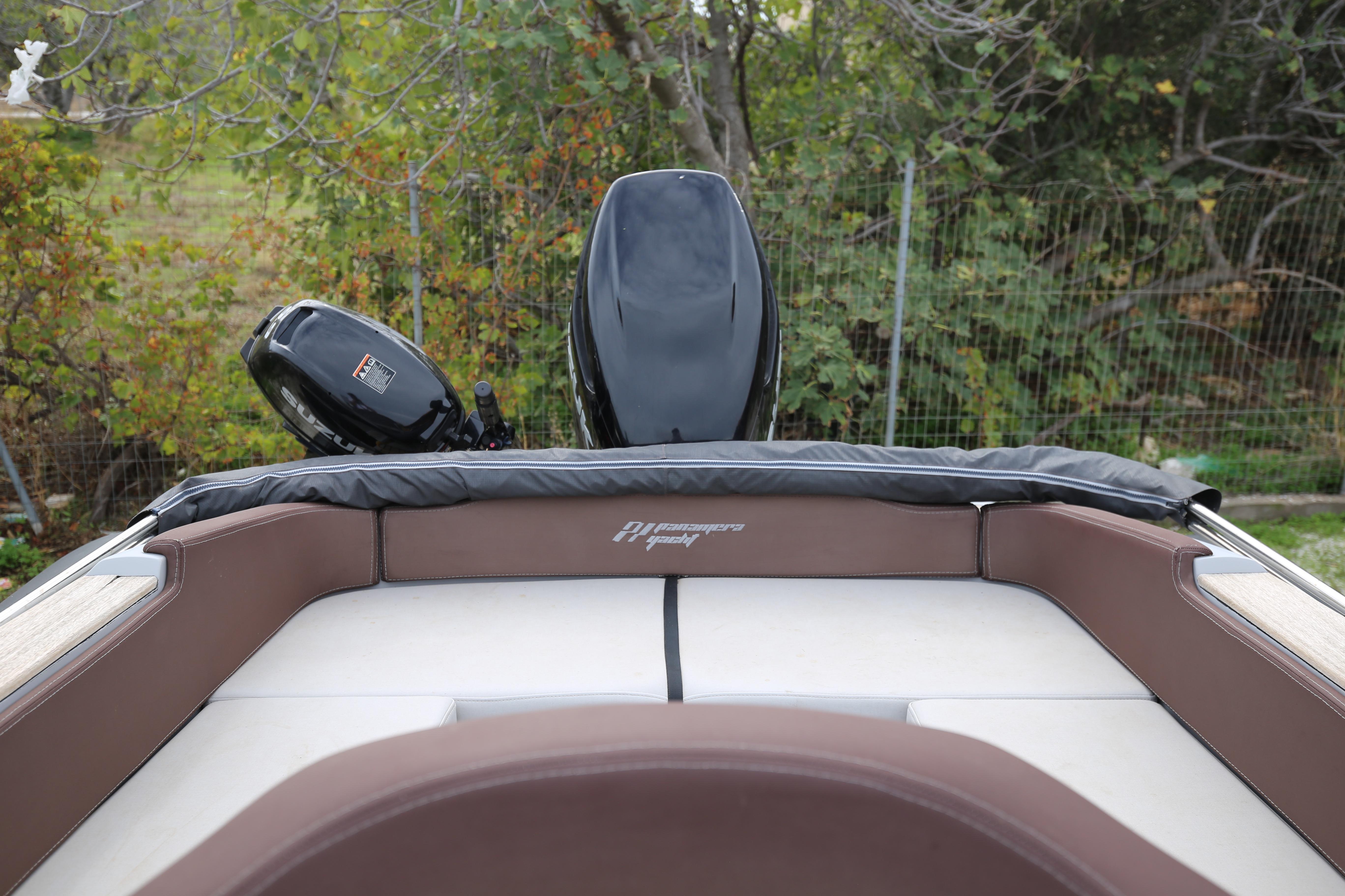The aft layout features a stylish C-shaped sofa that can be converted into a sunbathing area. The console opens easily and can be adapted to serve as a toilet or changing room. These solutions offer comfort and practicality on board.