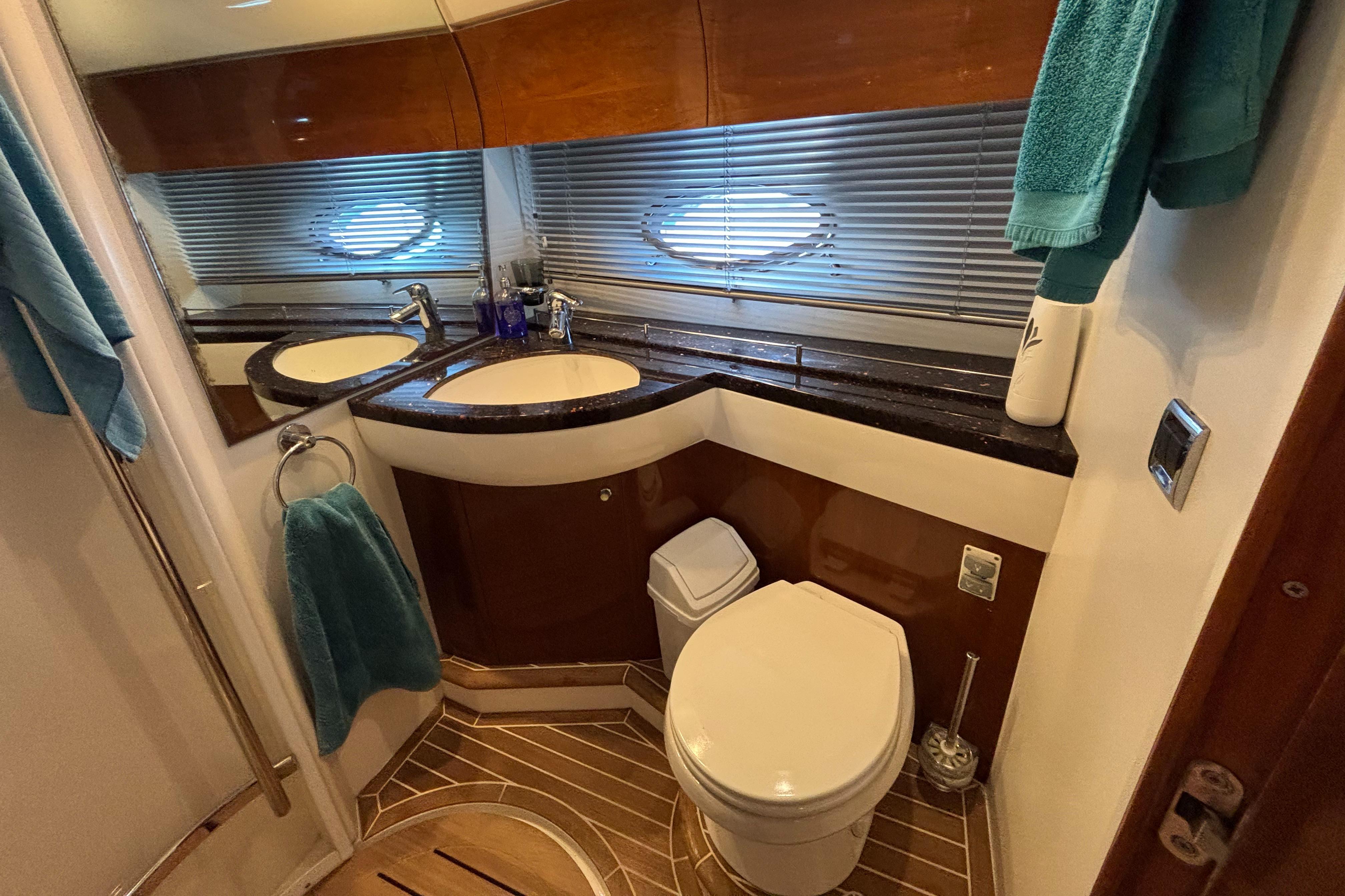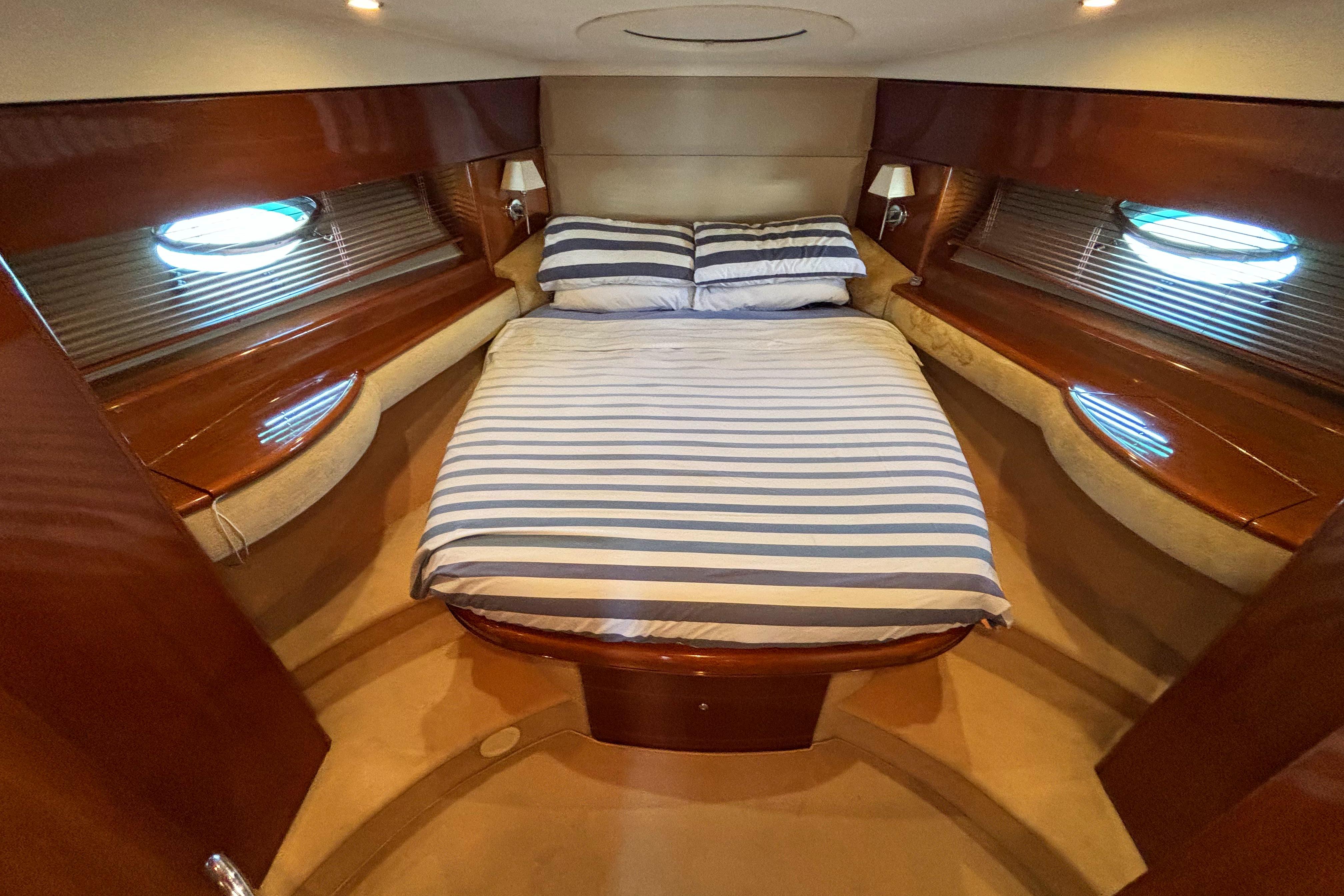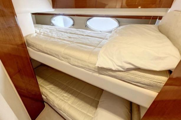 Interior Layout:The accommodation comprises three cabins and two bathrooms, sleeping up to six guests comfortably. The forward master cabin features a double bed with ample storage and natural light. The port VIP cabin offers a double bed, while the starboard guest cabin is fitted with bunk beds, suitable for children or additional guests.