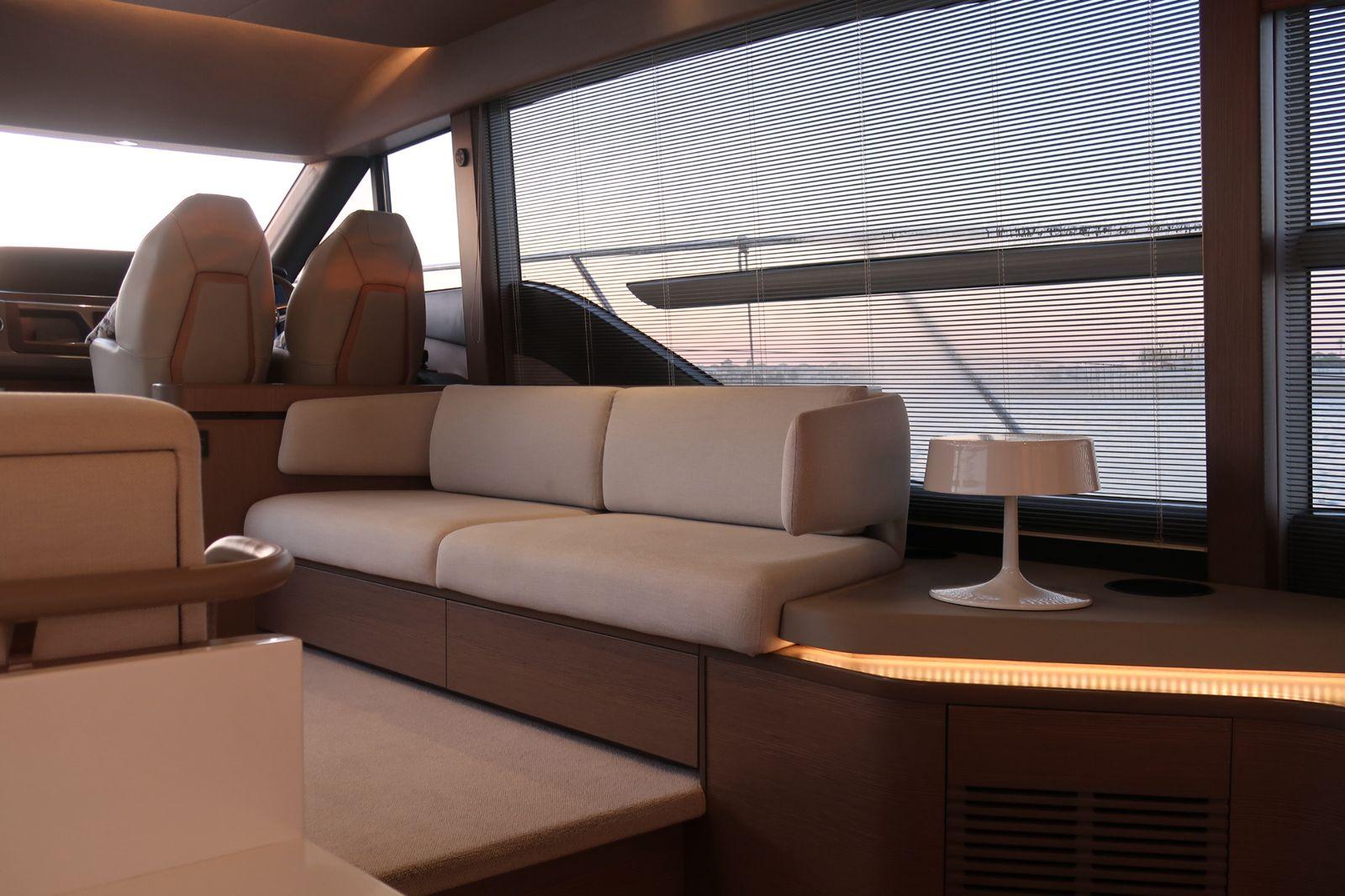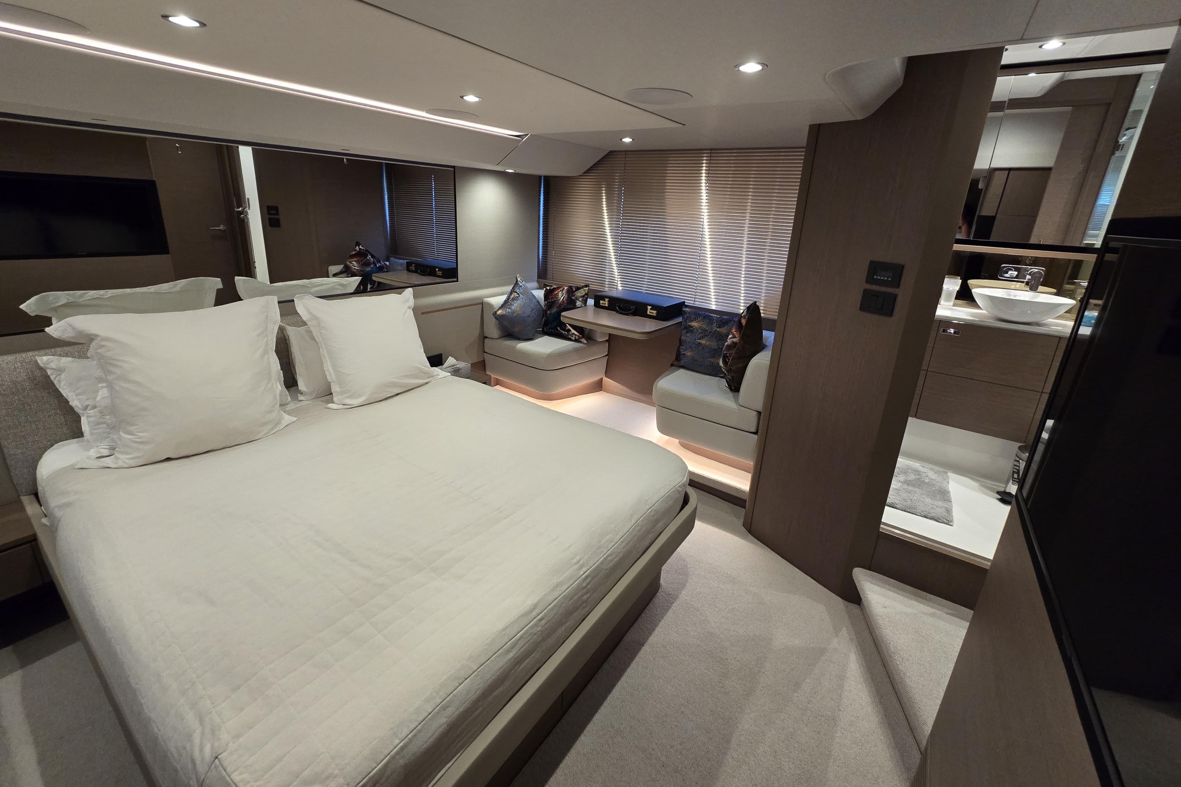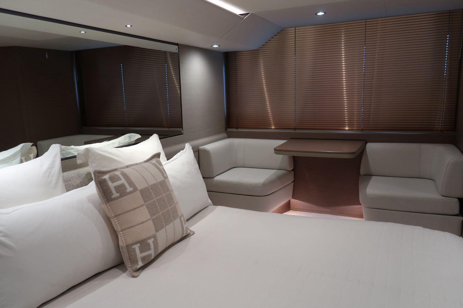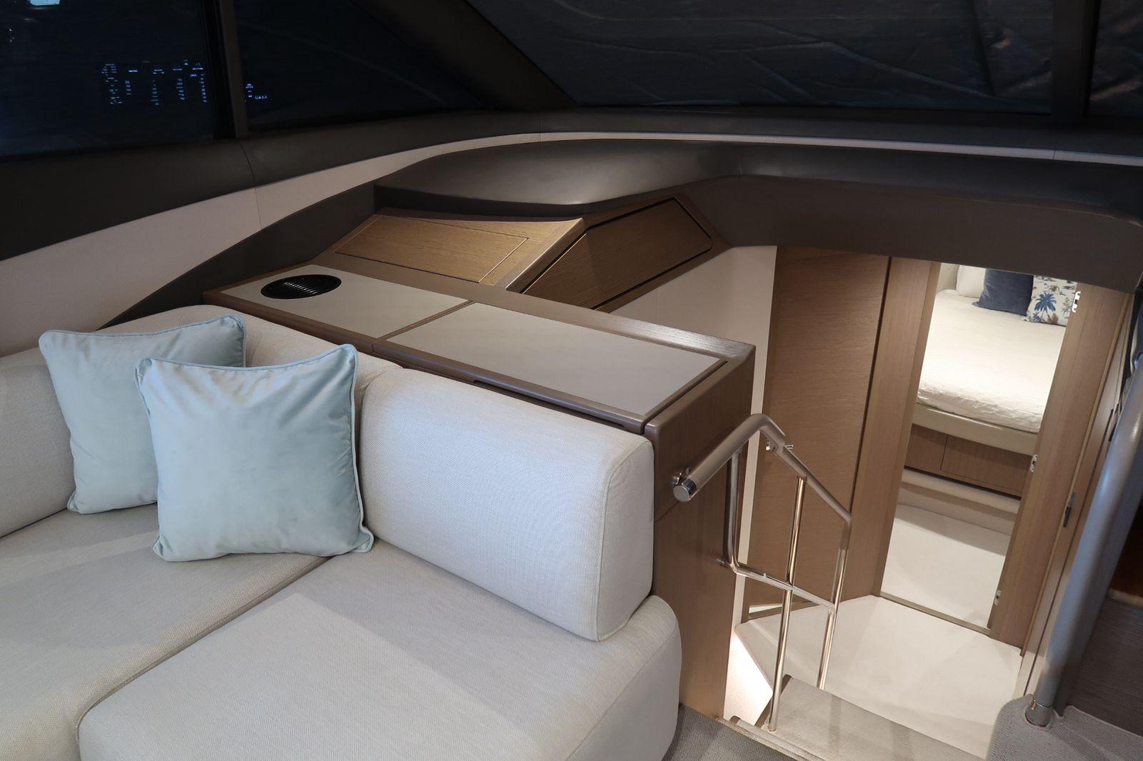 The living room of the Princess F55 is a space of ultimate comfort and elegance. The U-shaped sofa with a folding table that converts into a coffee table offers luxury and comfort, while the LED lighting creates a warm and inviting atmosphere. The large two-seat sofa and the side sideboard unit with storage spaces for glasses and bottles enhance the sense of luxury. Additionally, the refrigerator offers easy access to drinks and snacks, while the electric curtains ensure privacy with the touch of a button.