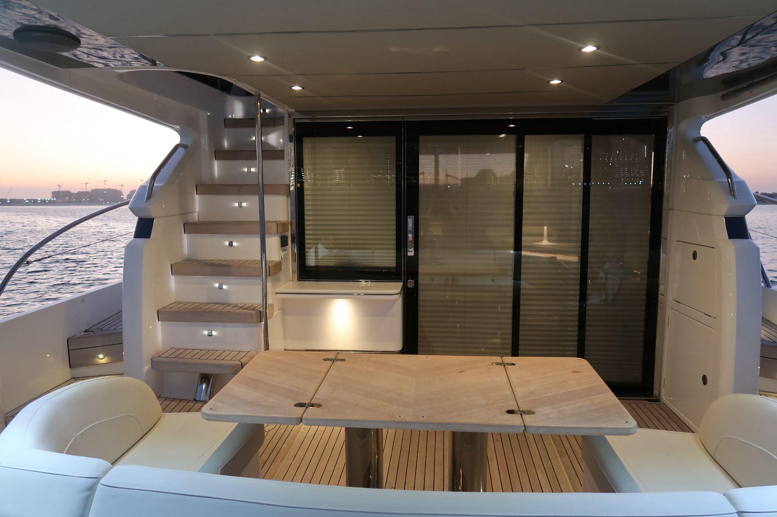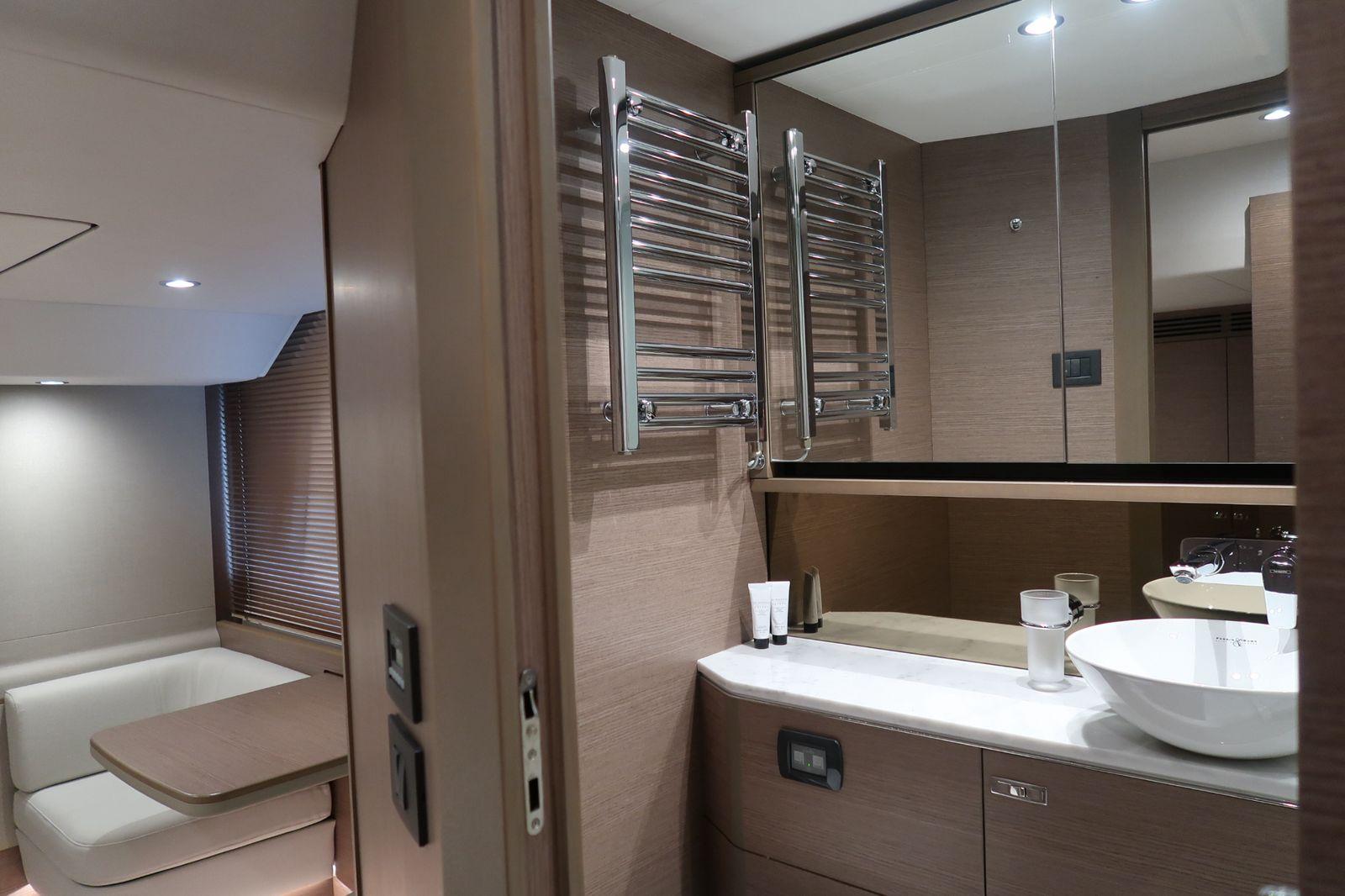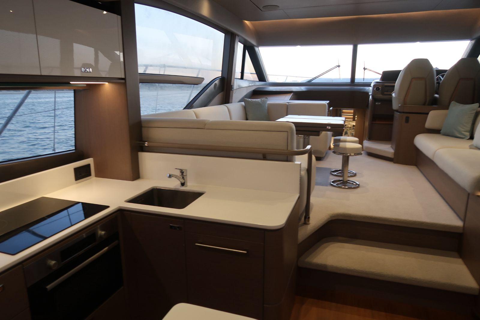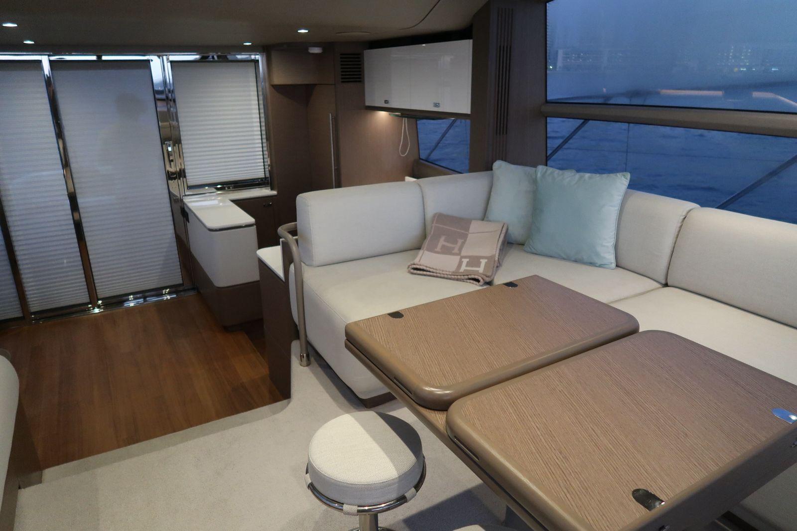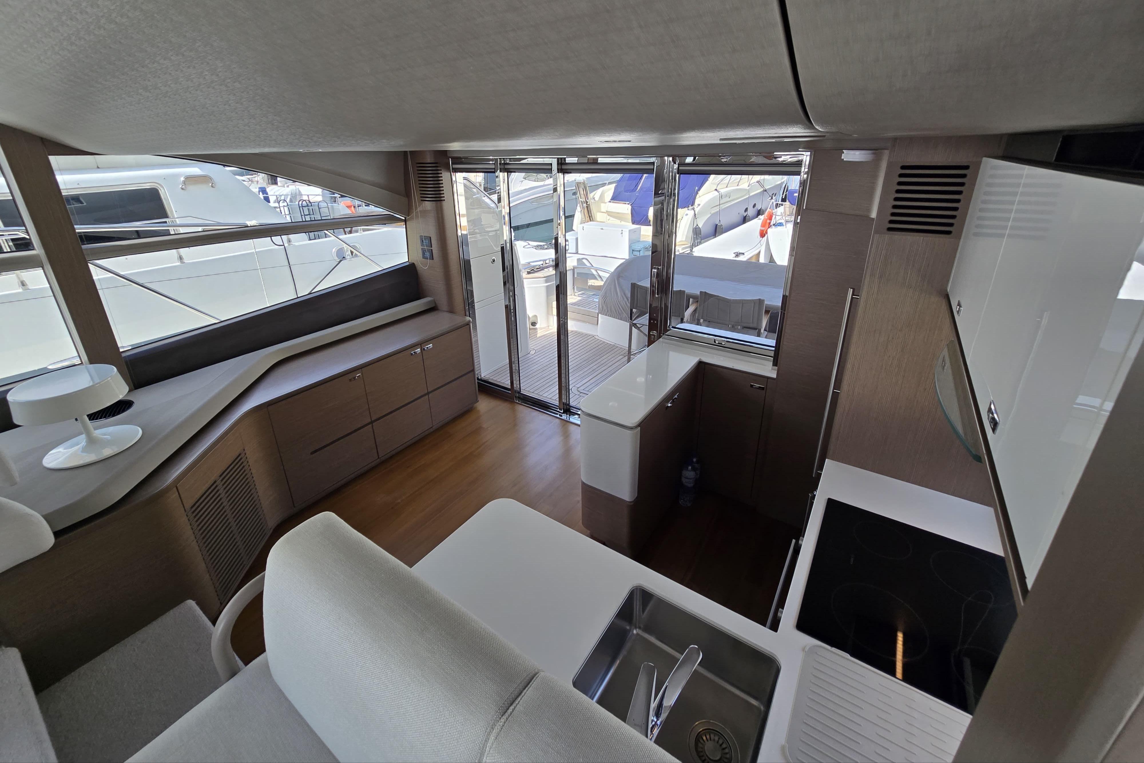 The living room of the Princess F55 is a space of ultimate comfort and elegance. The U-shaped sofa with a folding table that converts into a coffee table offers luxury and comfort, while the LED lighting creates a warm and inviting atmosphere. The large two-seat sofa and the side sideboard unit with storage spaces for glasses and bottles enhance the sense of luxury. Additionally, the refrigerator offers easy access to drinks and snacks, while the electric curtains ensure privacy with the touch of a button.