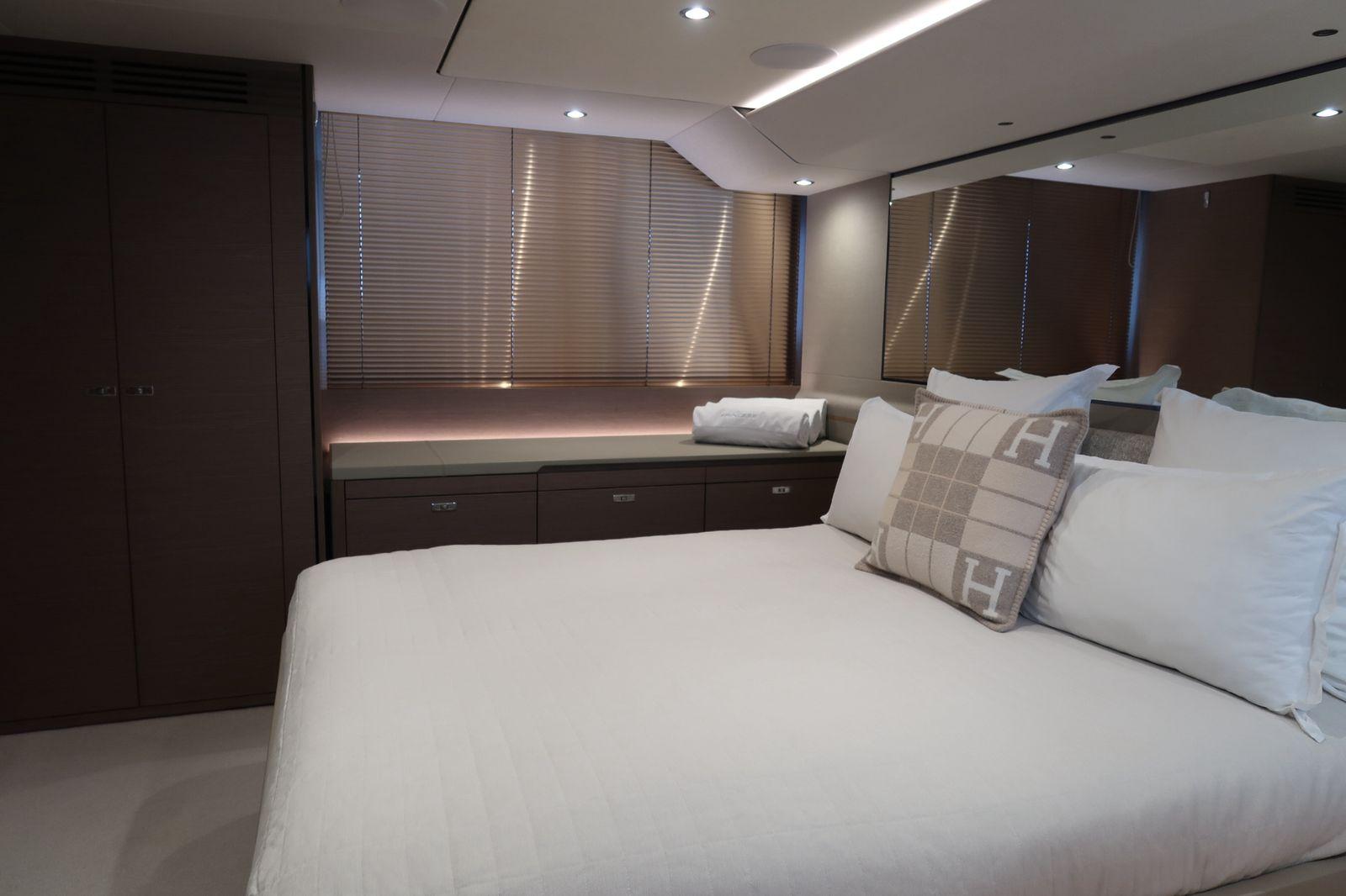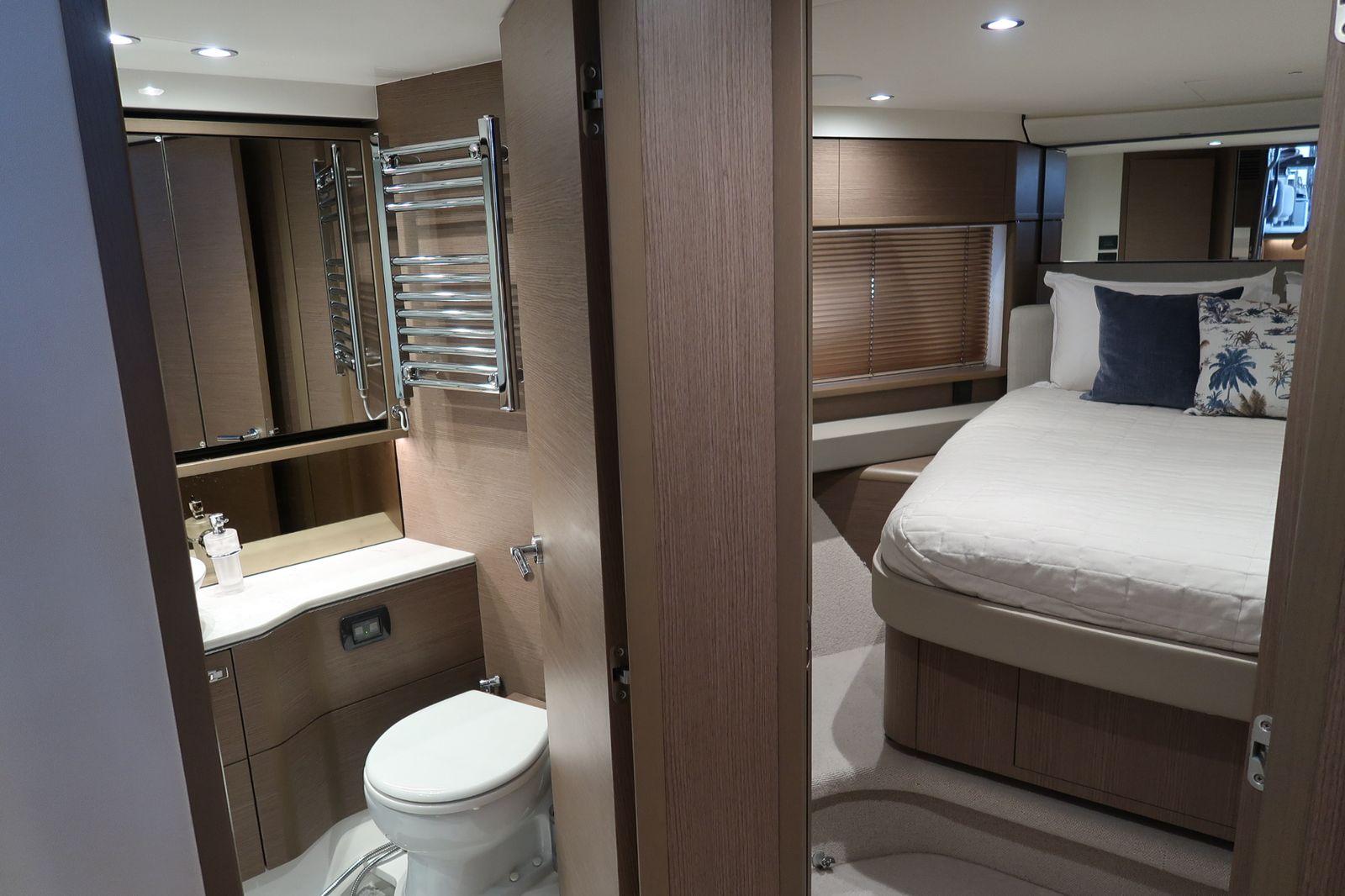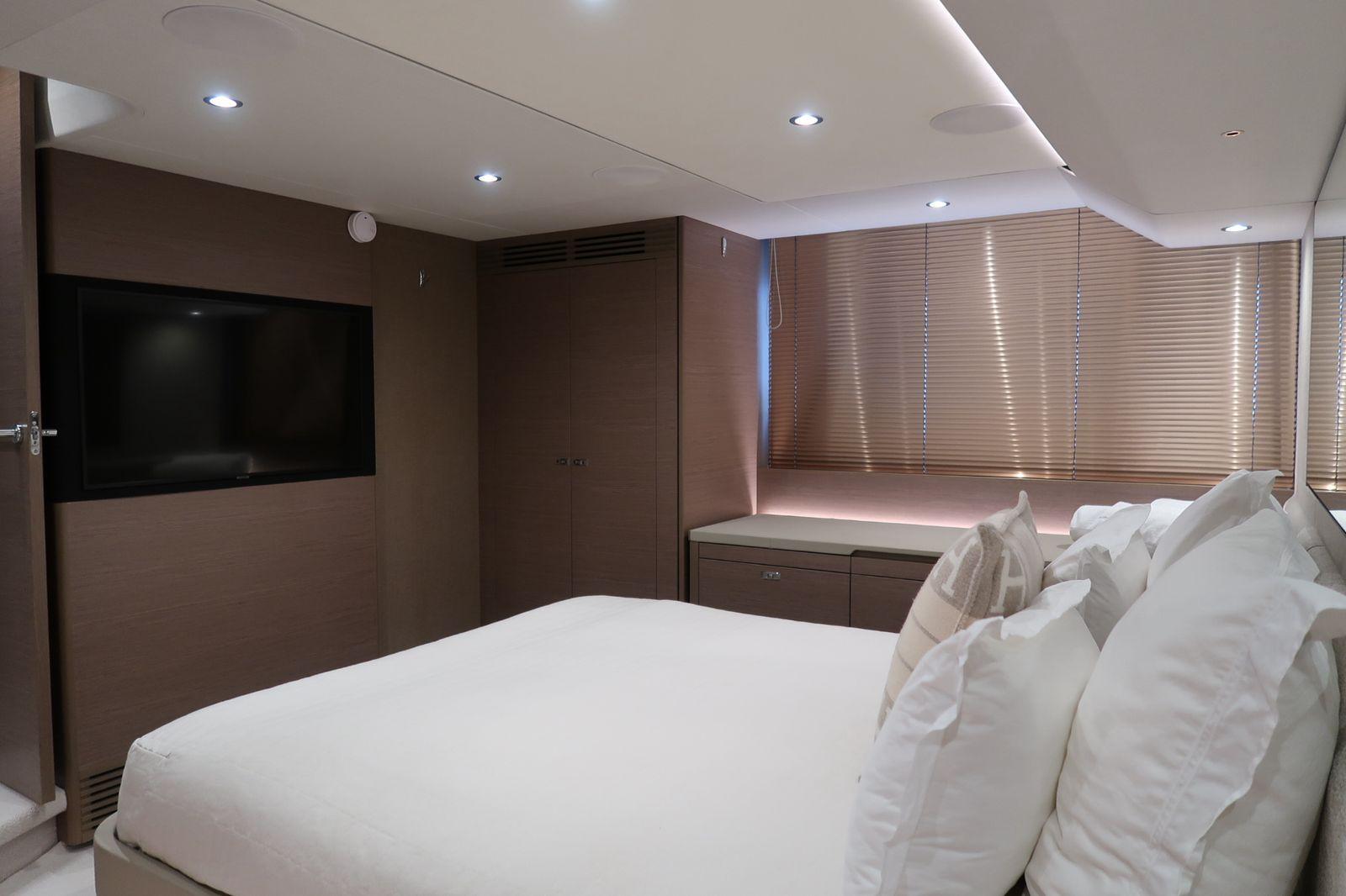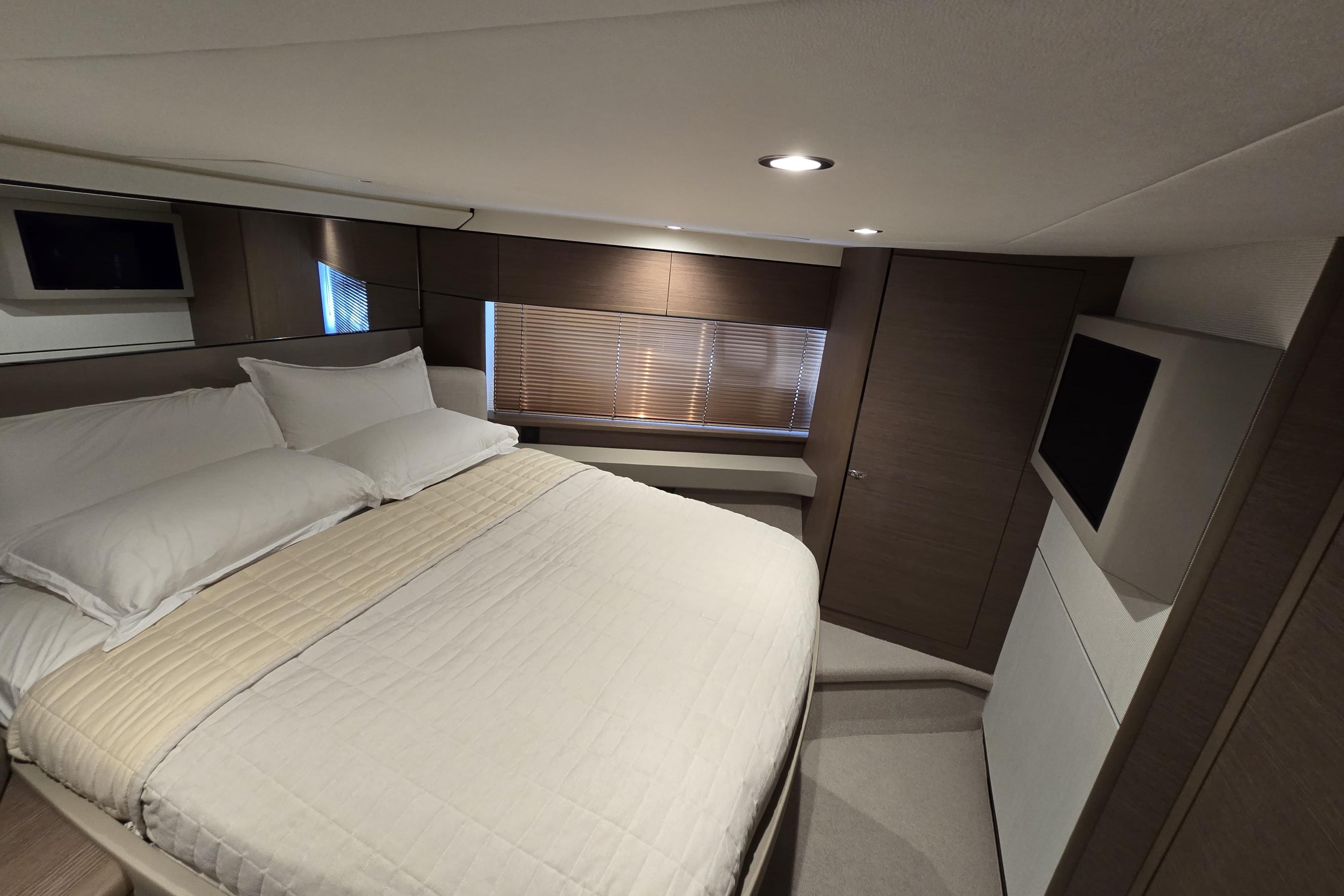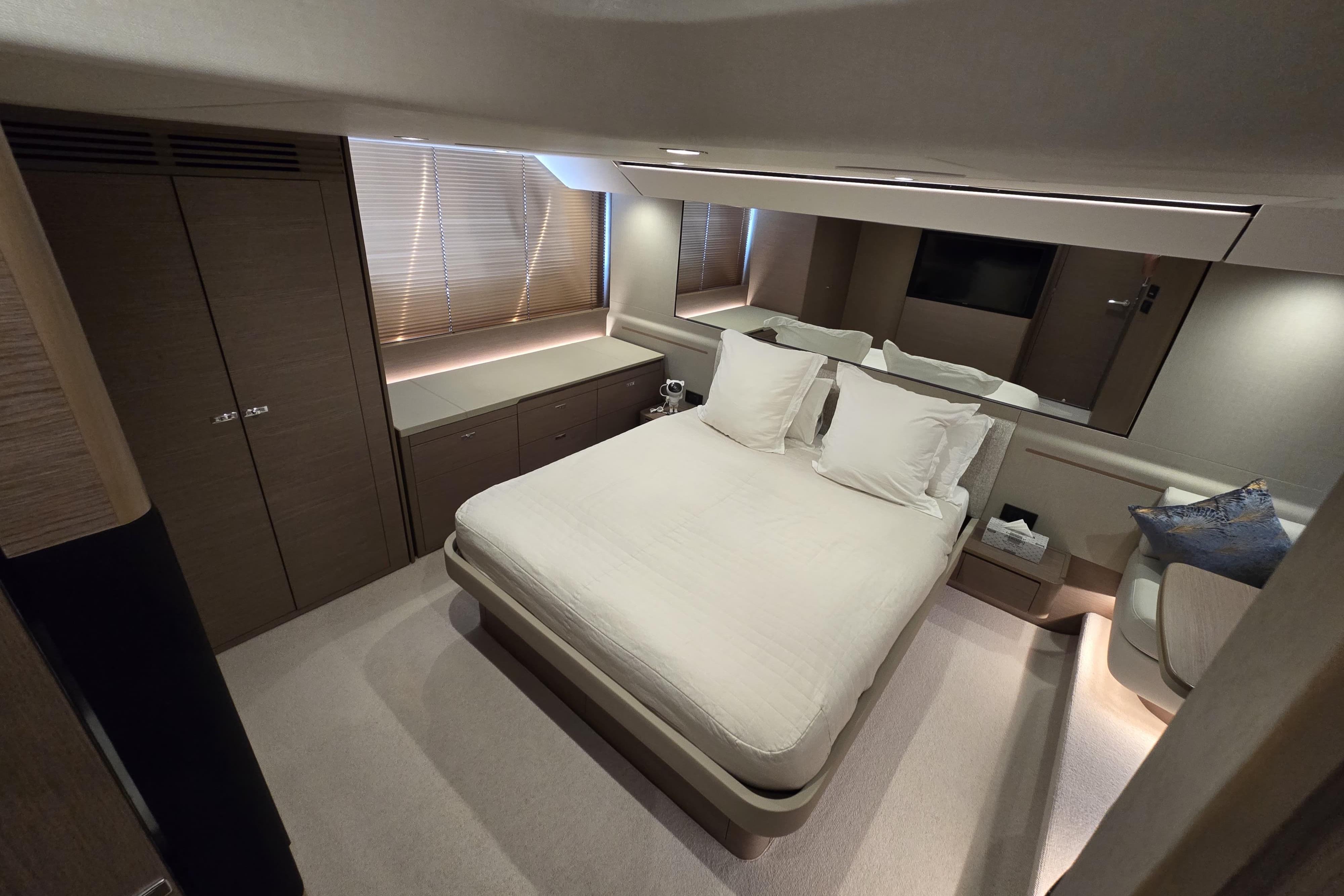 The Master Stateroom, extending across the full width of the yacht, offers an incredibly spacious and private area. It features a double bed with drawers underneath for additional storage, a wardrobe with shelves, and storage spaces for organizing personal belongings. The room is equipped with a 40" TV and a table, creating a relaxing and comfortable atmosphere. The en-suite bathroom includes a separate shower area, while the excellent view from the window and abundant natural light create the perfect space for rest.