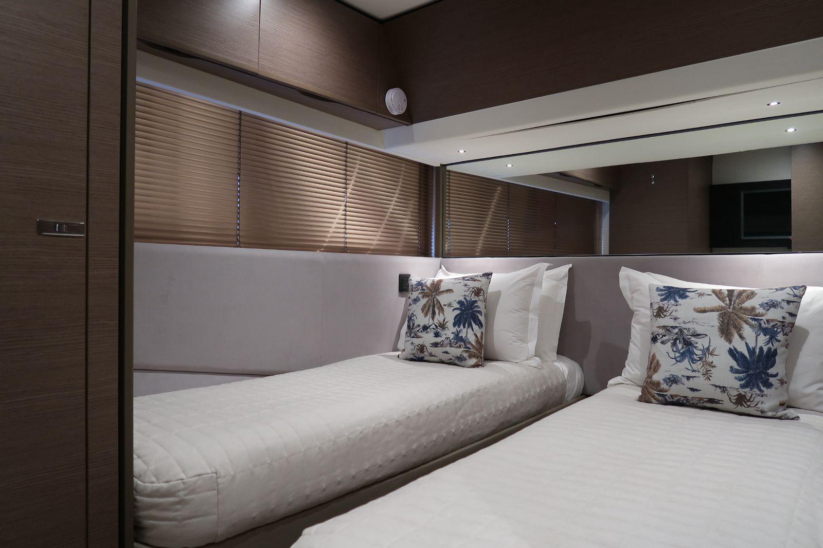 The Twin cabin is located on the starboard side of the yacht and features two single beds with drawers underneath for additional storage. The wardrobes with shelves and storage lockers ensure organized storage for your personal belongings. This cabin is also equipped with a 28" TV for entertainment and enjoyment.