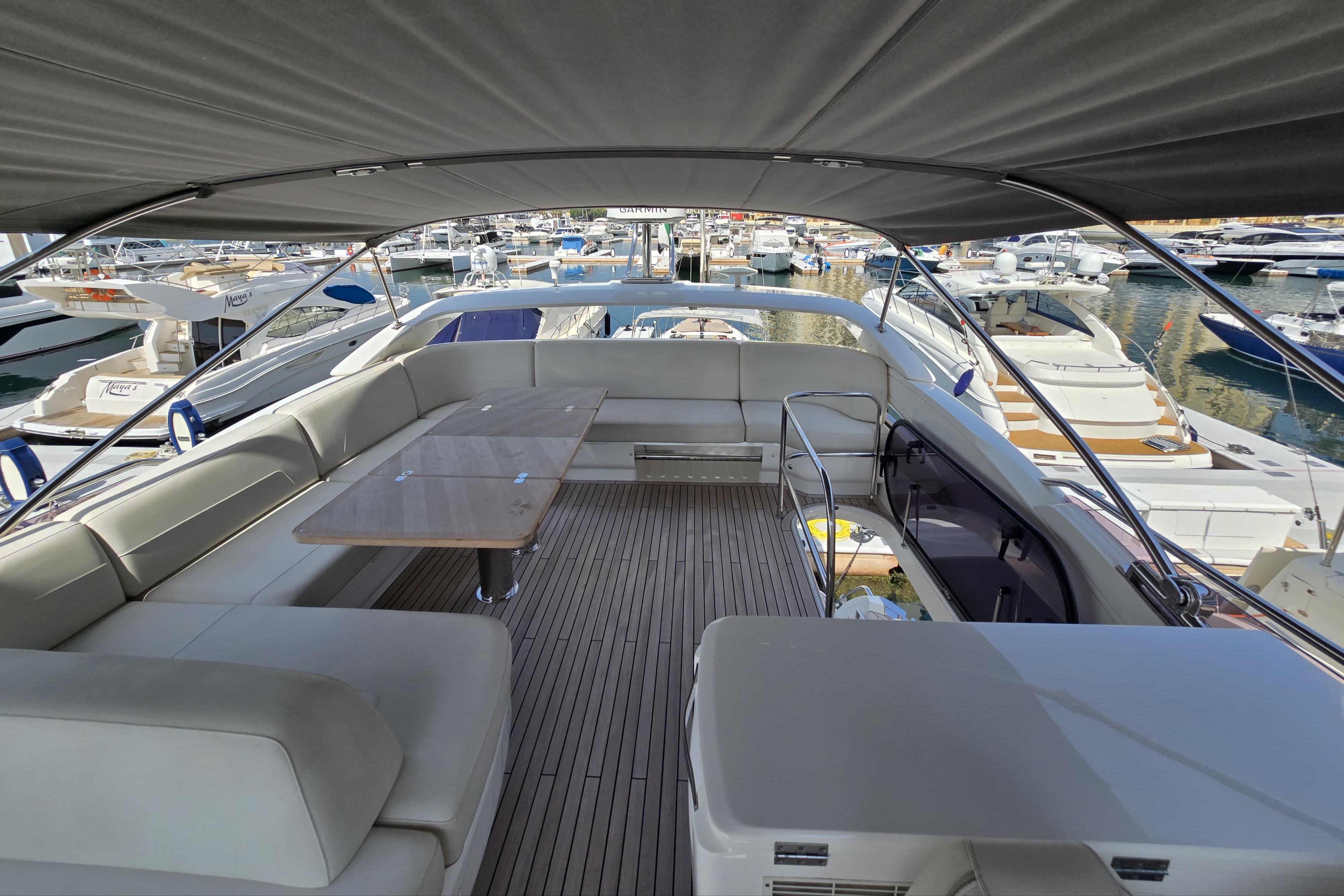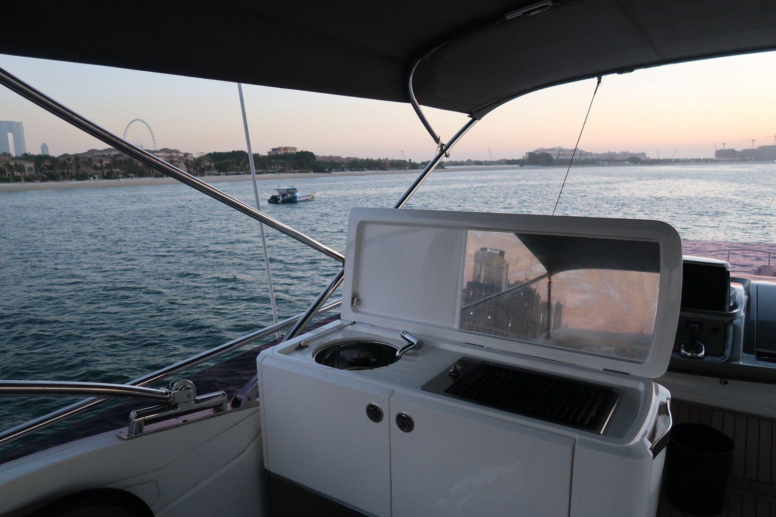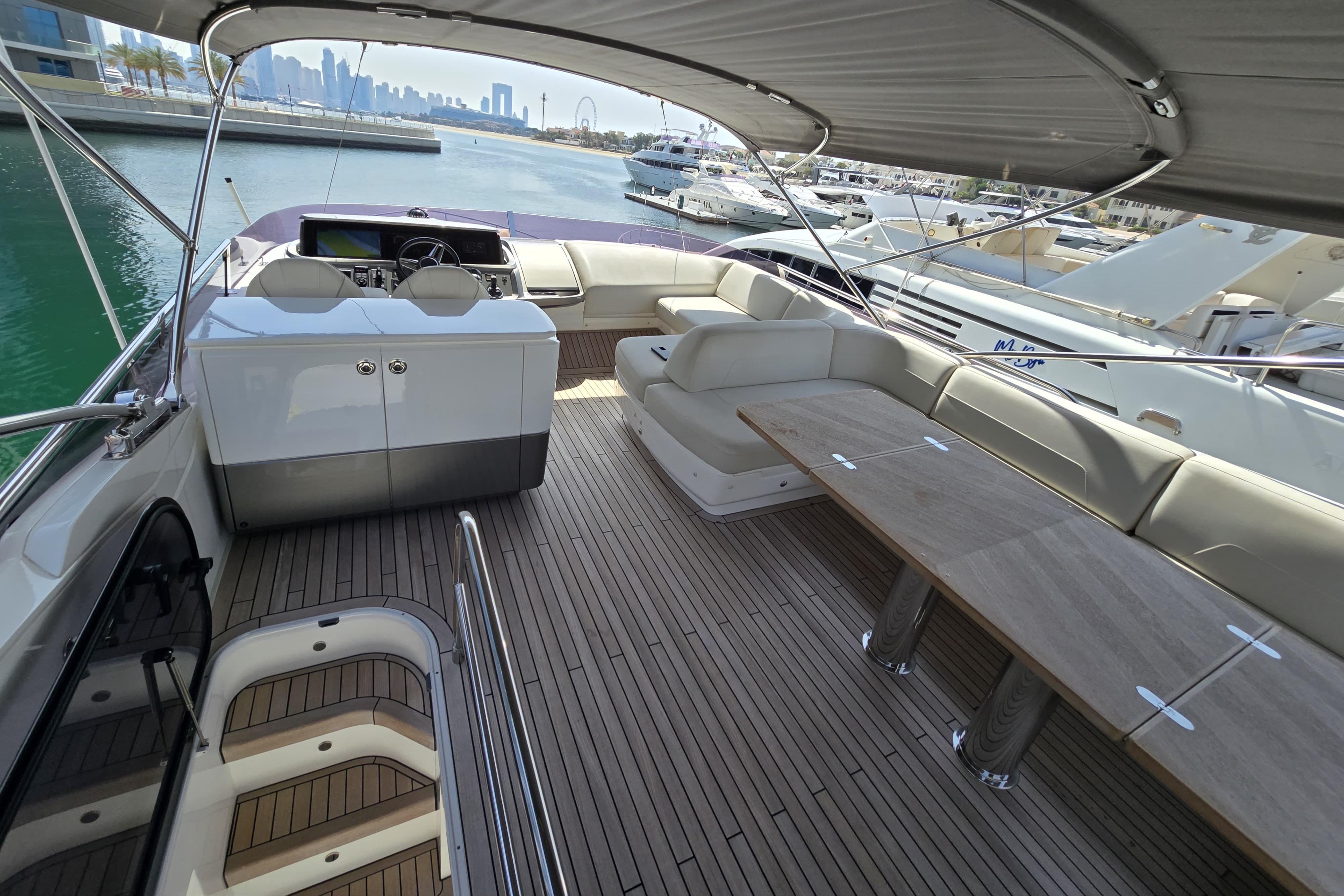 The yacht's exterior is equally impressive, with a spacious seating area on the flybridge, featuring a fully equipped wet bar with a sink and space for a BBQ grill. The seating area can be converted into a sunbed for sunbathing. The grey bimini cover protects passengers from the sun, while the hydraulic transom platforms provide easy access to the water and enhance the yacht's usability.