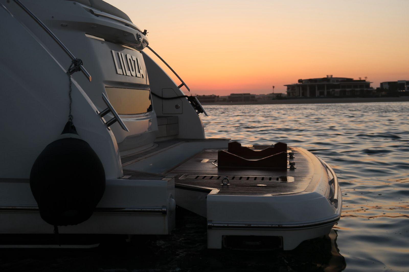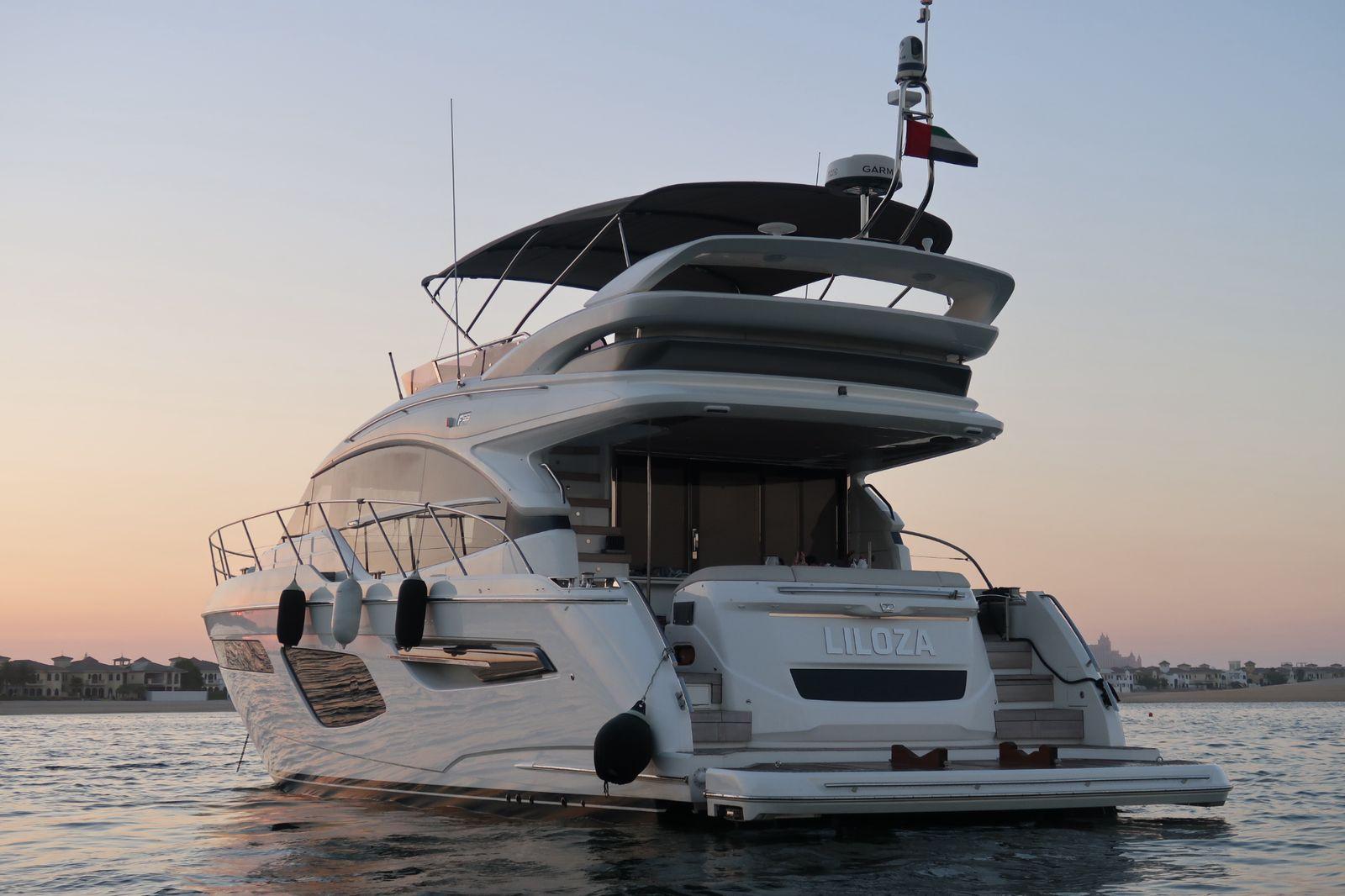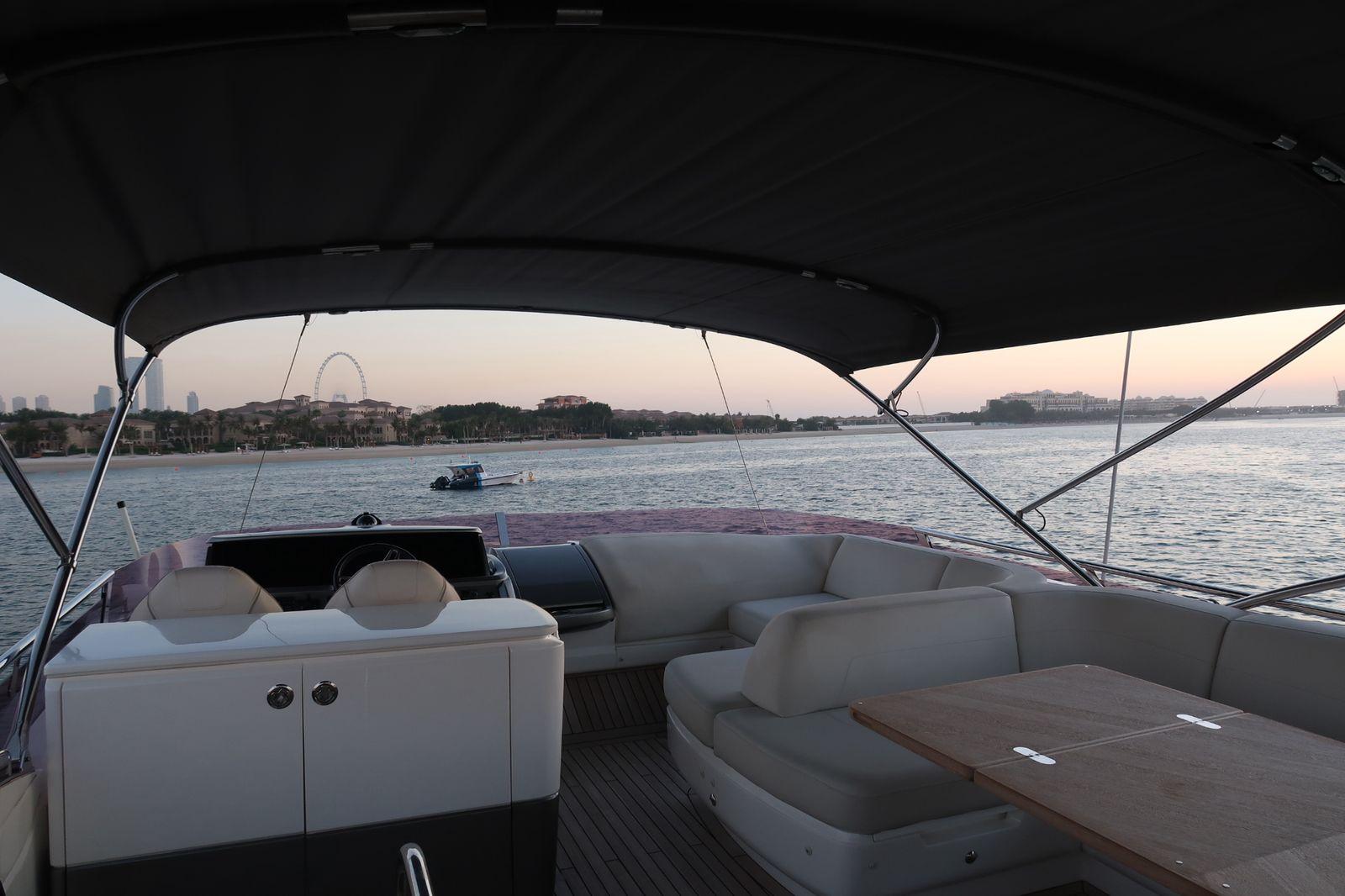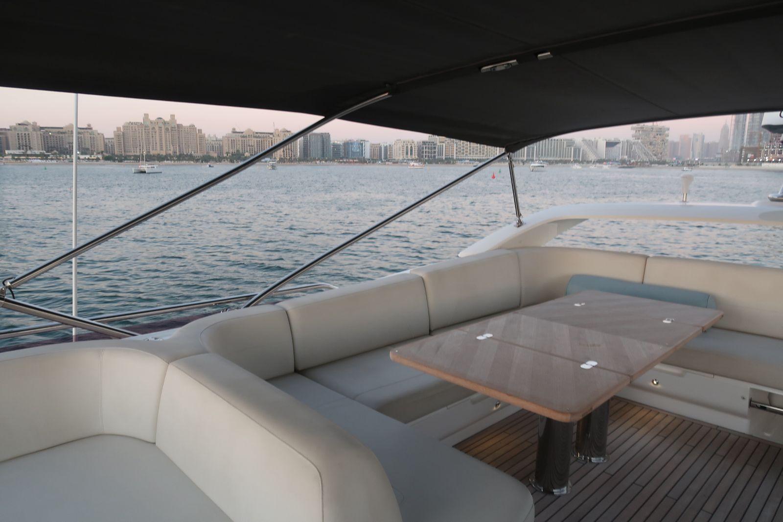 The yacht's exterior is equally impressive, with a spacious seating area on the flybridge, featuring a fully equipped wet bar with a sink and space for a BBQ grill. The seating area can be converted into a sunbed for sunbathing. The grey bimini cover protects passengers from the sun, while the hydraulic transom platforms provide easy access to the water and enhance the yacht's usability.