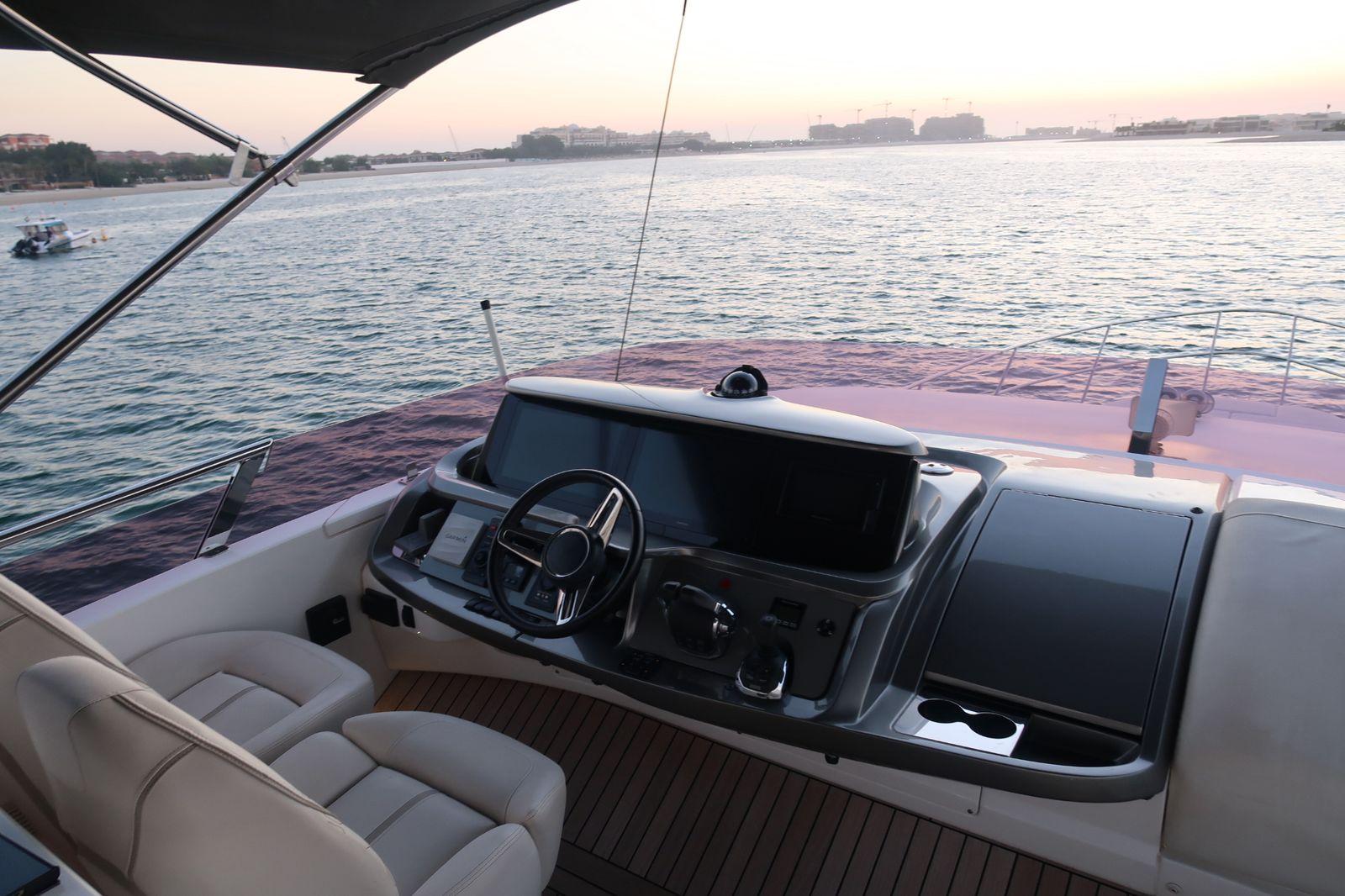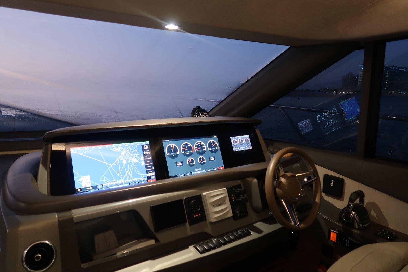 Aft navigation area with joystick, bow and stern thrusters, and chain counter.