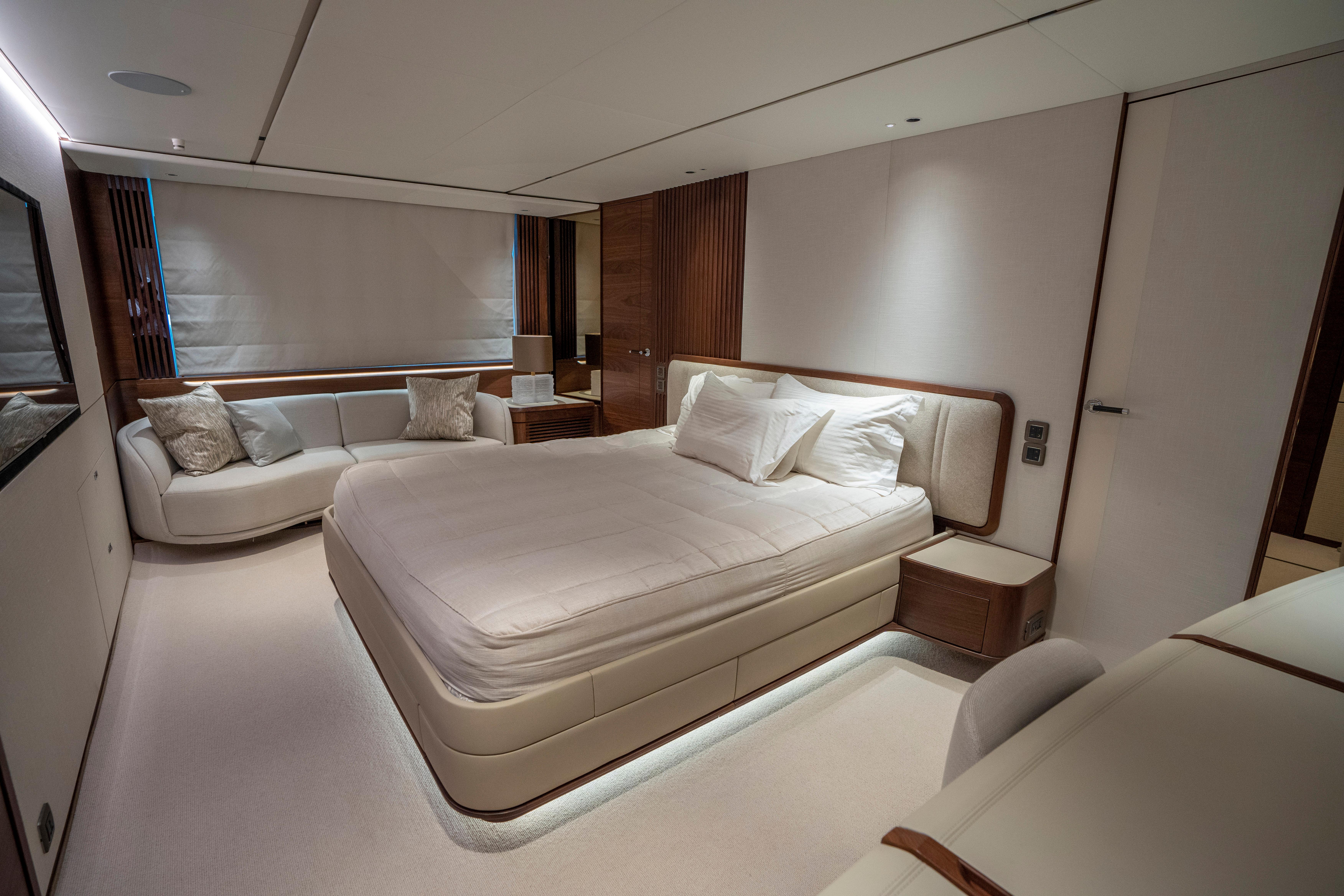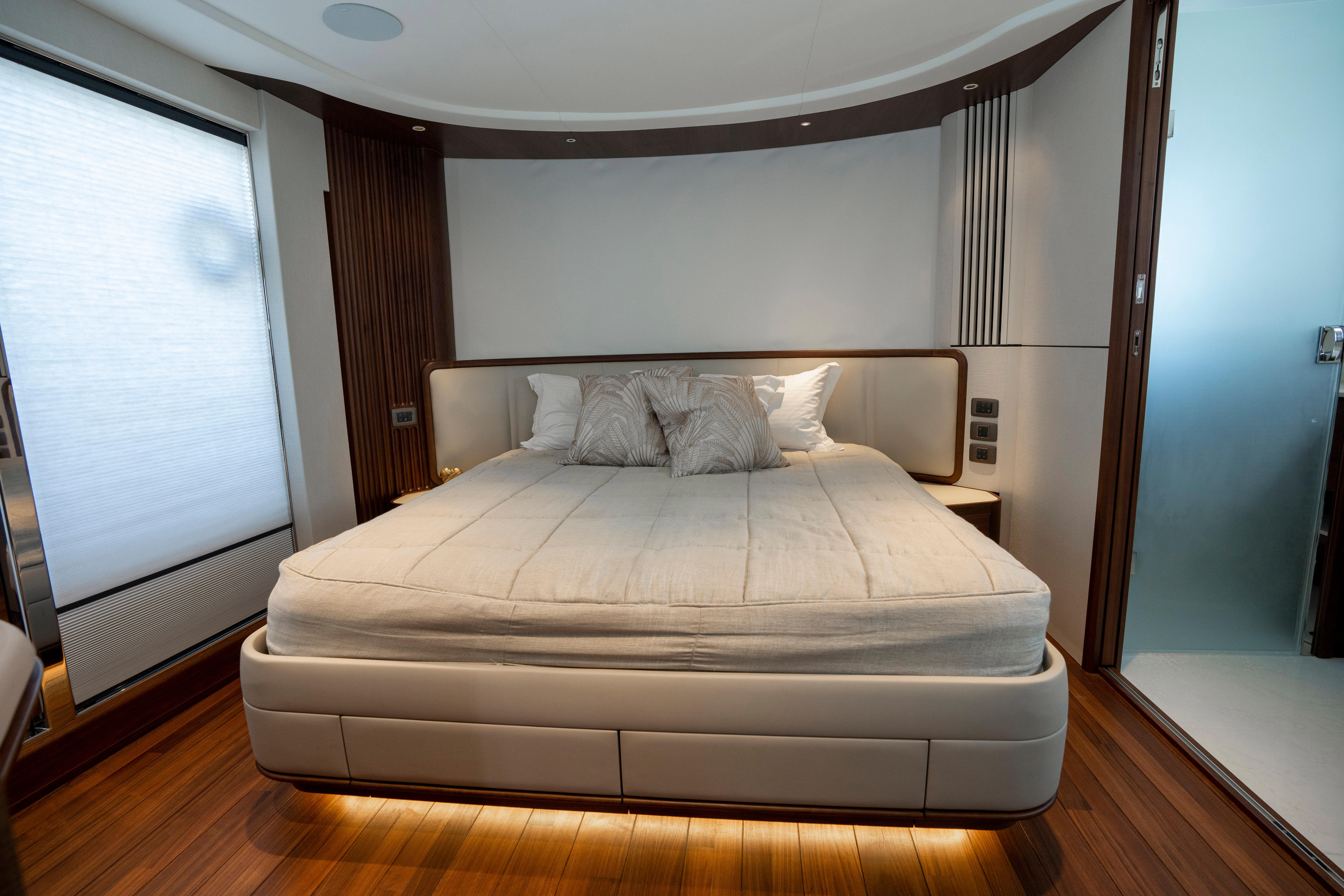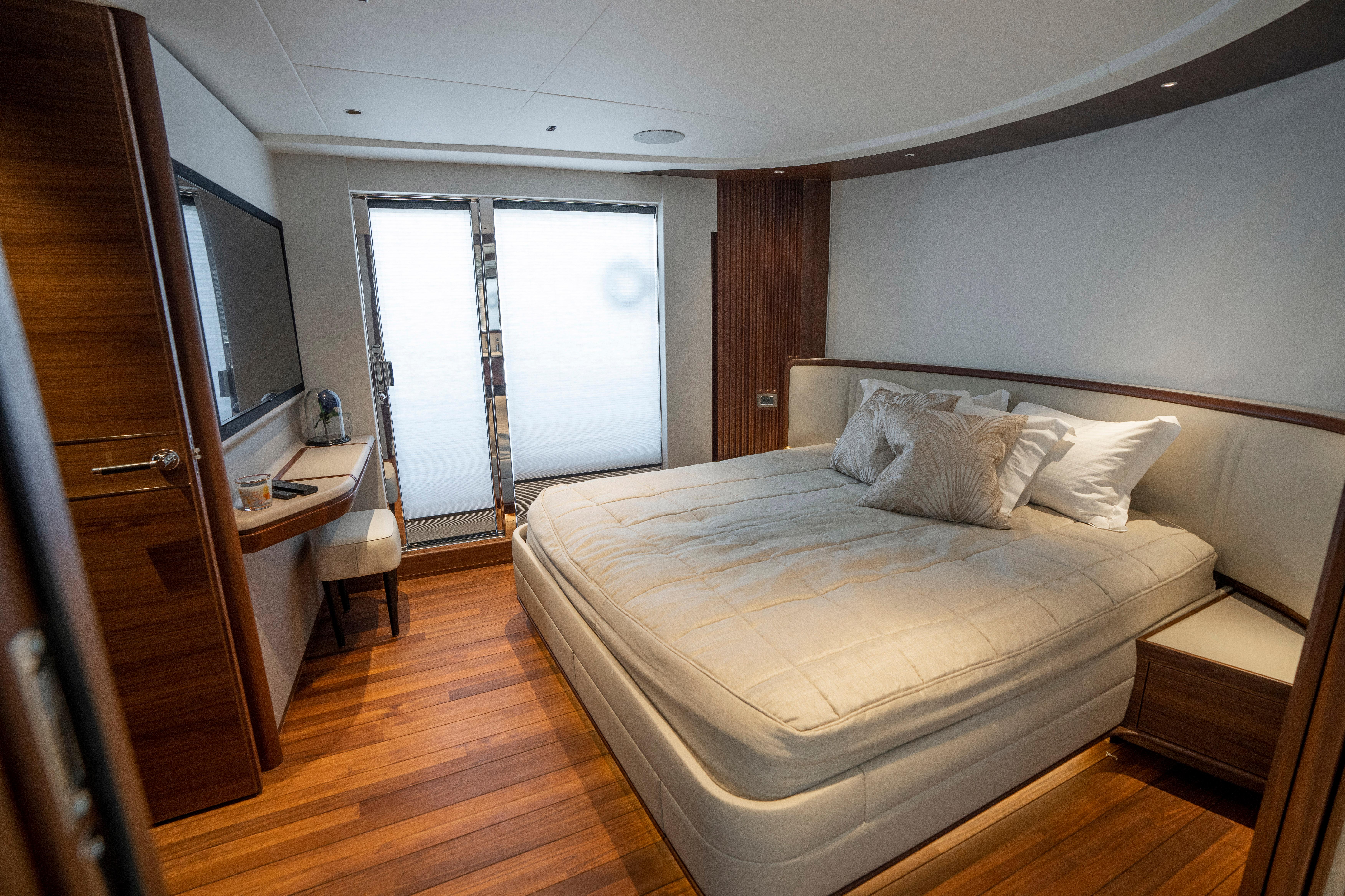 Main deck master stateroom fit out includes a built in safe as standard. Includes electric curved blind to fwd window and electric day/night blind to port side full height glazing/hinged door (when selected), in place of manual.