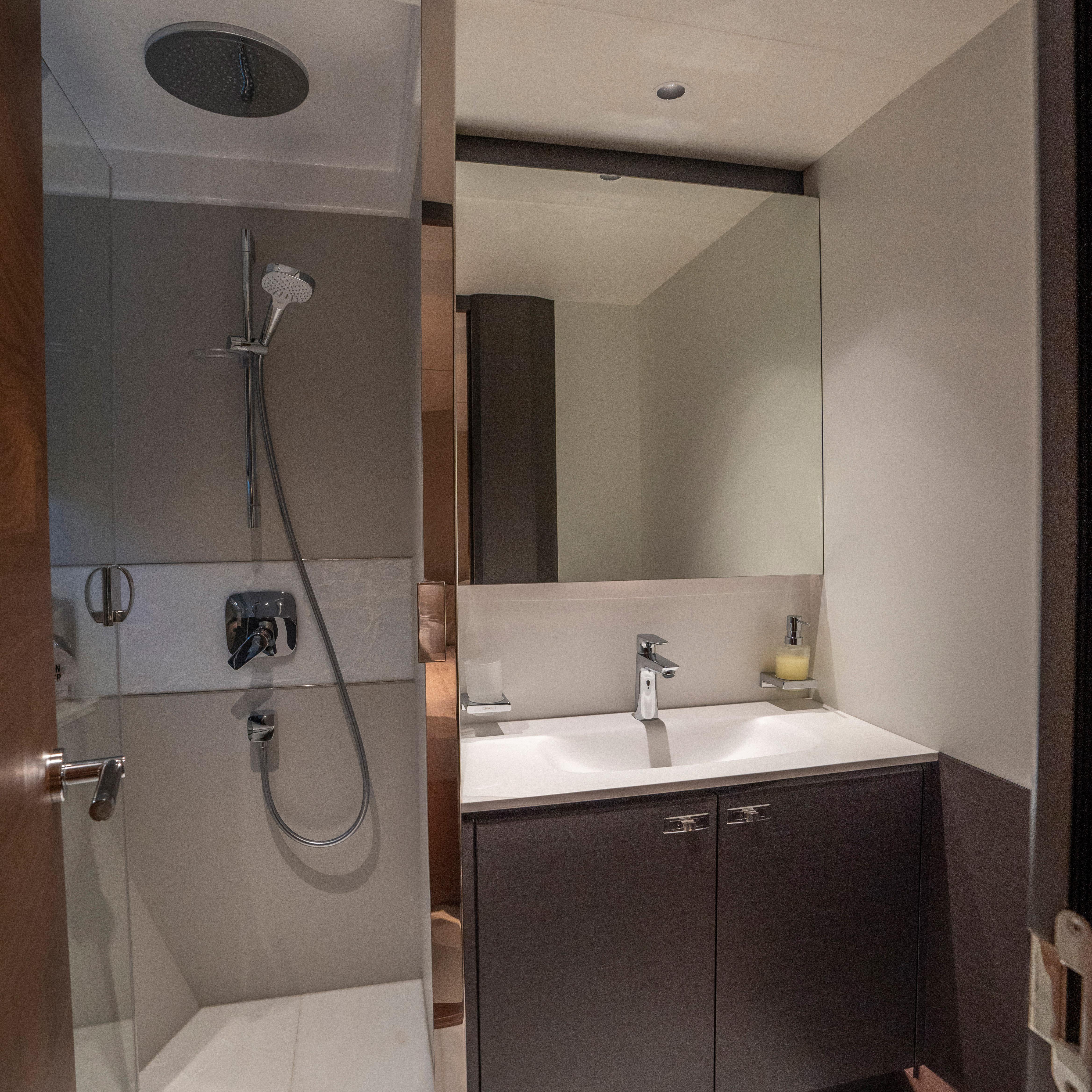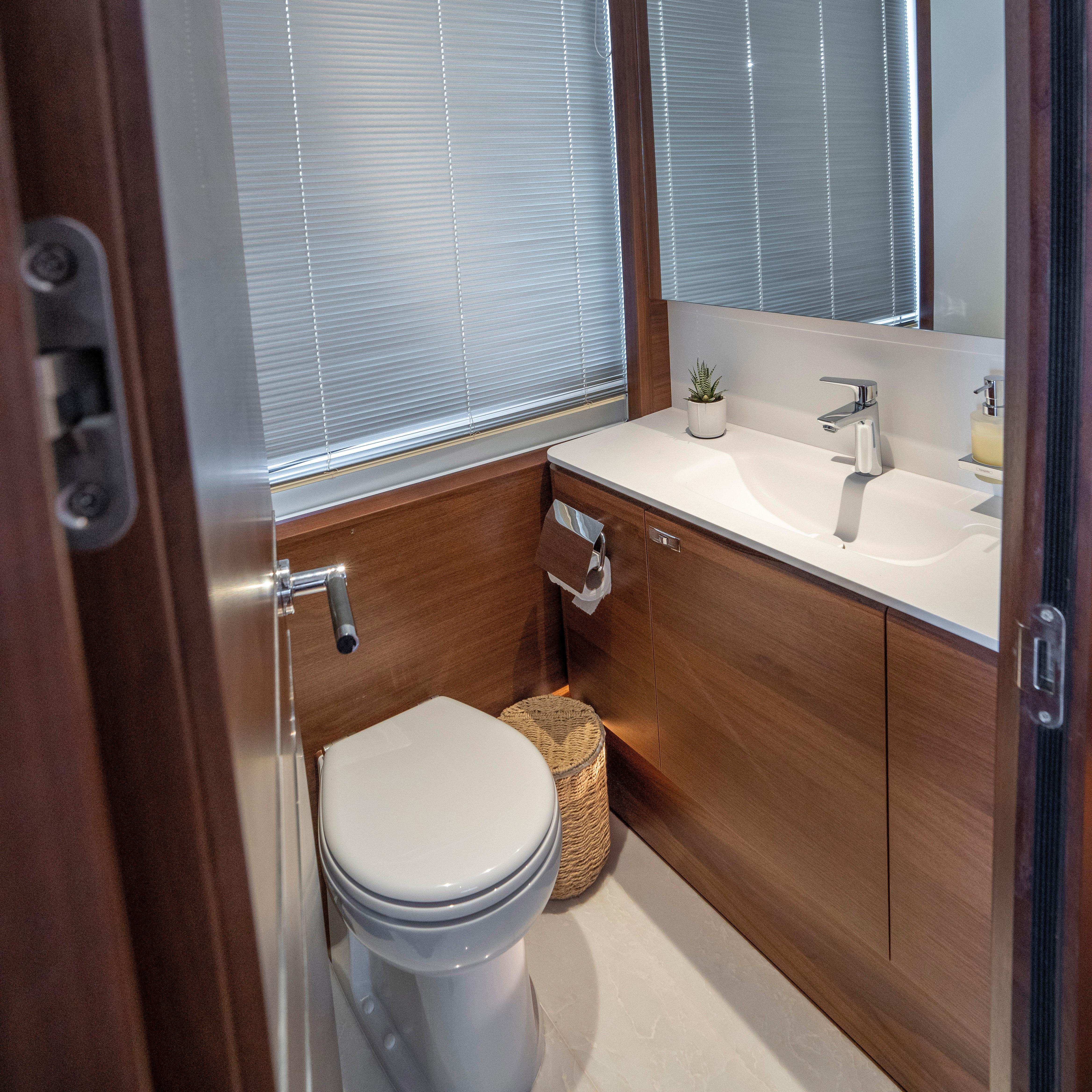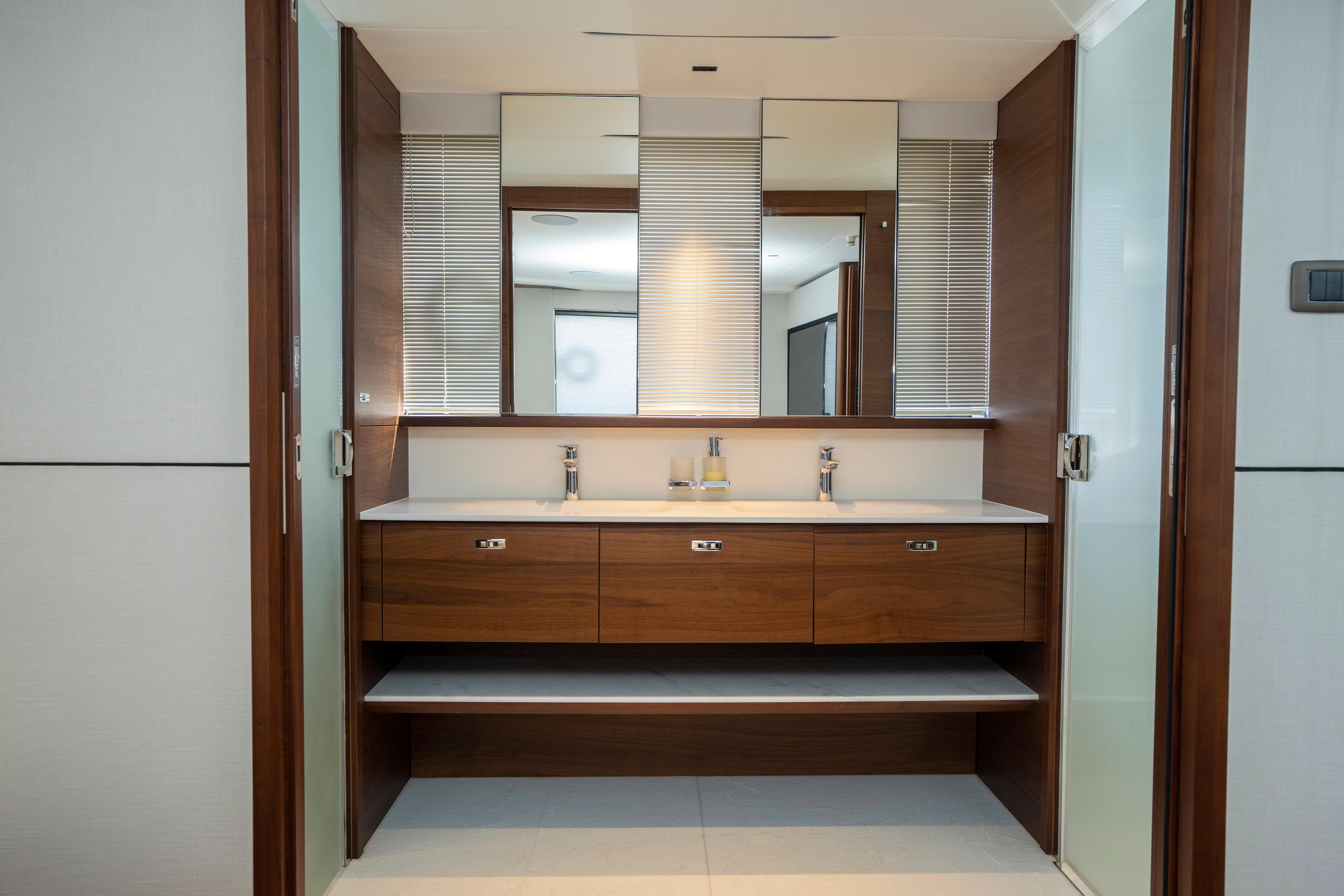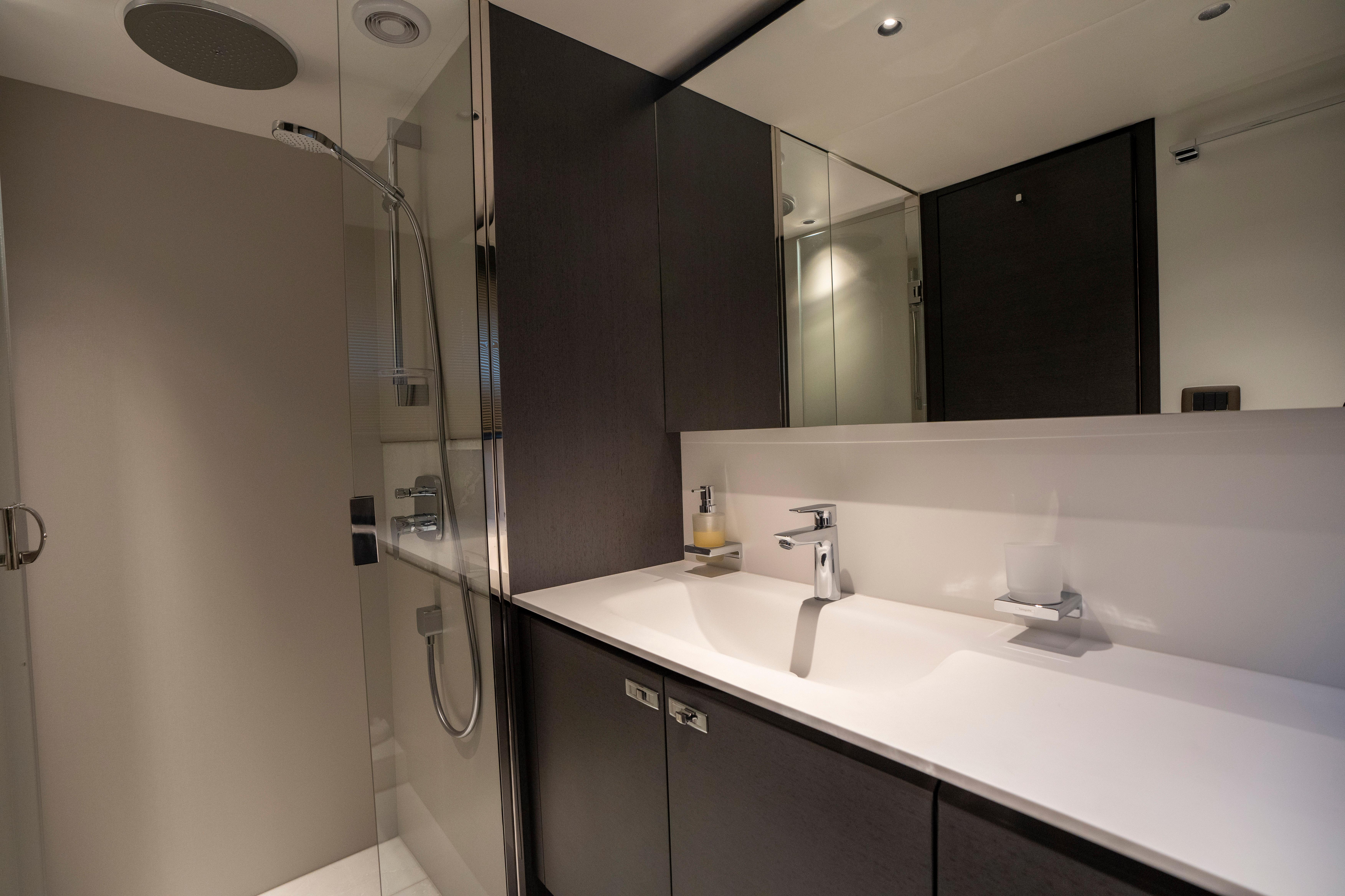 Bathroom floors have Carrera White Solid Surface (satin finish) as standard in master stateroom bathroom (including optional main deck master stateroom when selected), all guest bathrooms and day head. Wash basins, vanity tops and splashbacks are in thermoformed Sylmar White Solid Surface (satin finish). Feature shower bulkheads and shower floor to have synthetic teak accents as standard in master stateroom bathroom and all guest bathrooms.