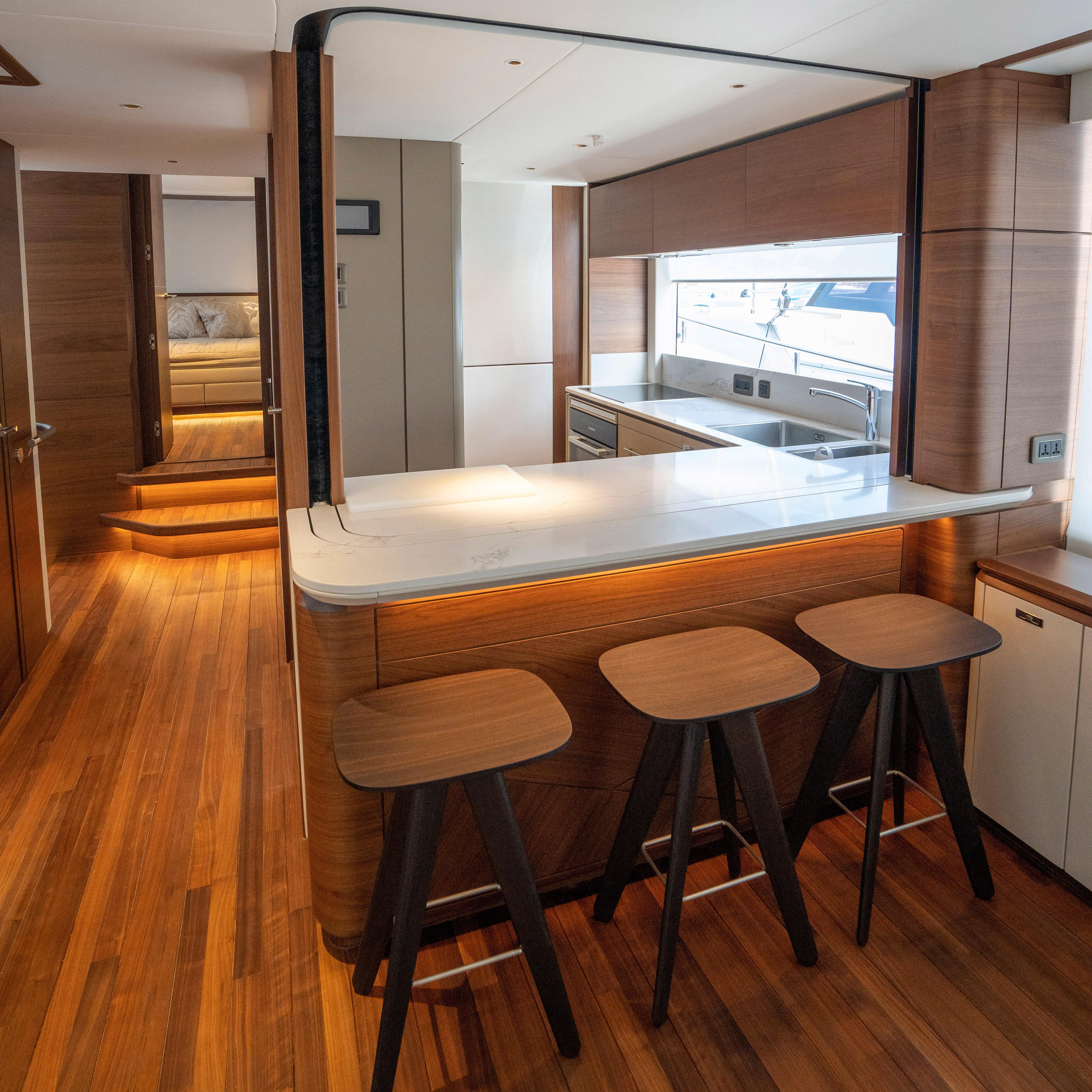 Starboard galley with lifting screen, forward dining area with dinette sofa with 4 dining chairs.