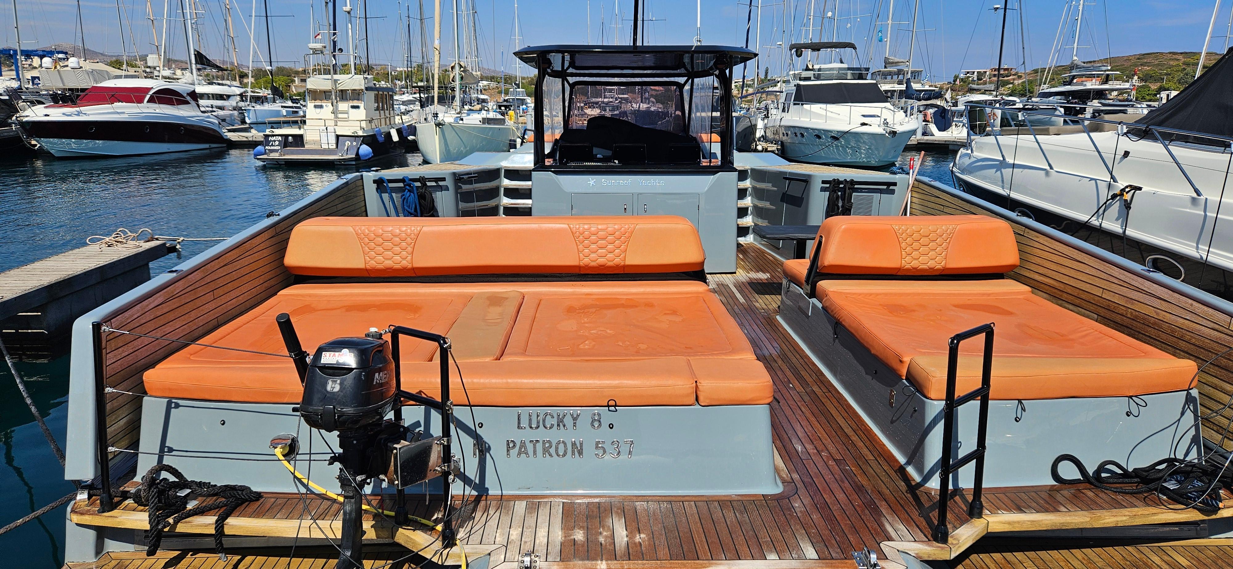 A one-and-only yacht is available now for sale. It is the ideal cruiser yacht for daily events and sea trips with 12 or more passengers on board. She is spacious, with super extra sun lounges, a centre helm console and a big bow sunbed on deck. Below deck there is a really big, futuristic cabin with a double bed, a galley with a saloon area, and a toilet with big storage.