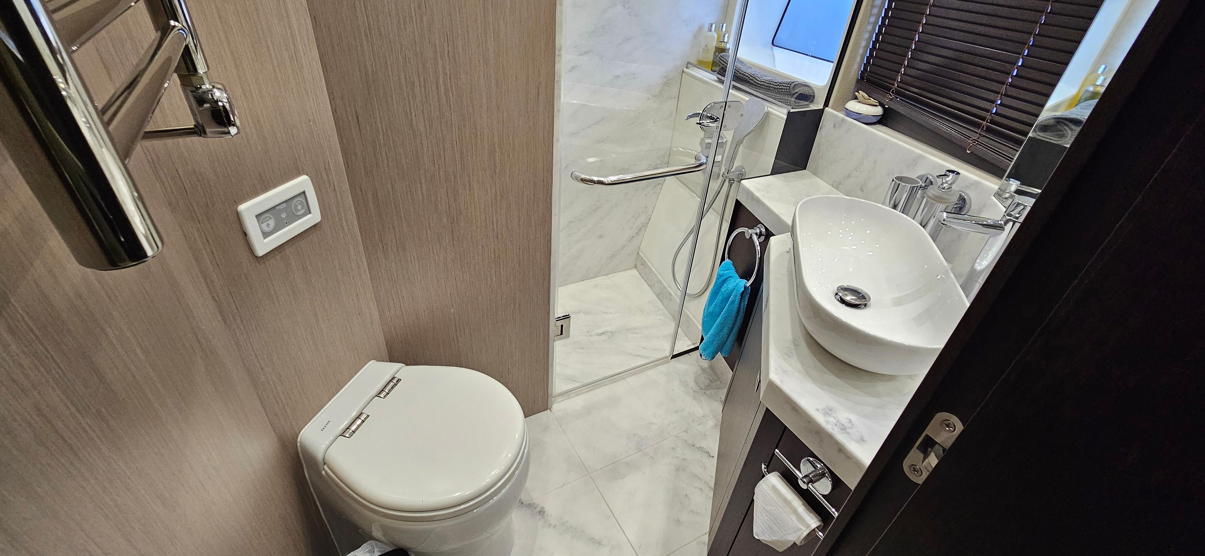 Moving on to the saloon area, there is a sleek design and good proximity to the helm, which is found very appealing. At the helm, the chairs are comfortable with a modern all-glass dashboard, which does not feature any traditional dials. Descending below deck, the guest cabins are toured, highlights are the large wardrobes and good-sized beds. Another optional layout could mean one of the guest cabins can be made into an ensuite. The full-beam owner's cabin has its own private access via a stairway from the main deck. Main features are the large windows, quaint breakfast nook, and a sizable TV. The owner's cabin also has an impressive ensuite shower.