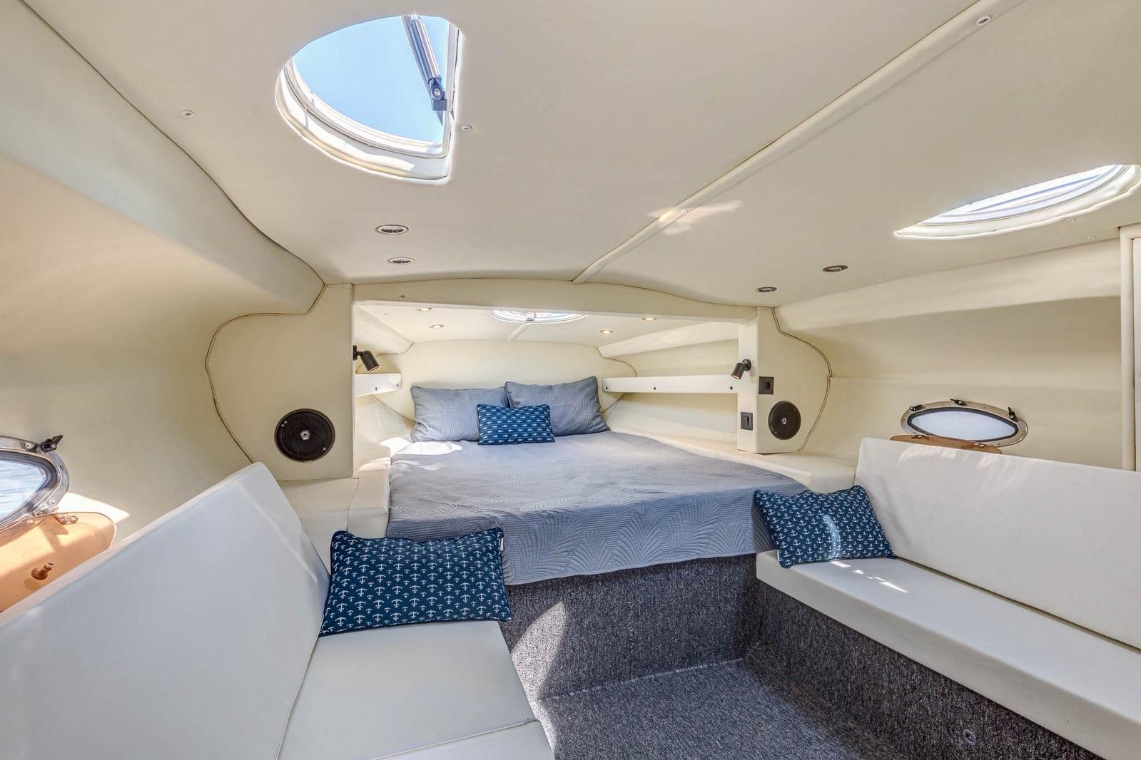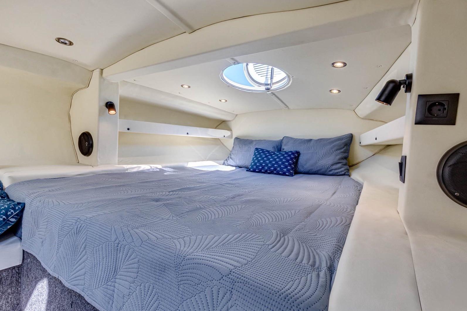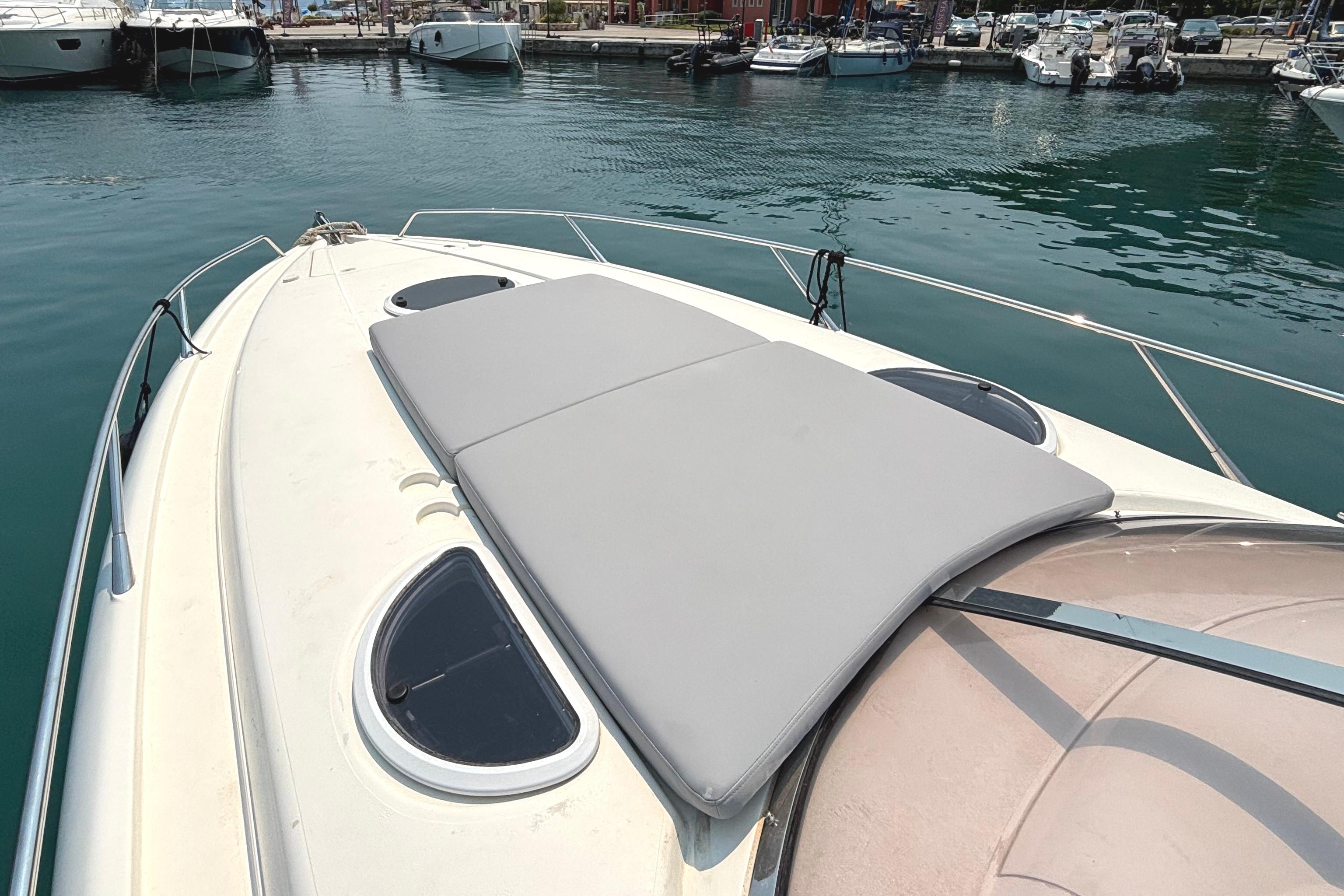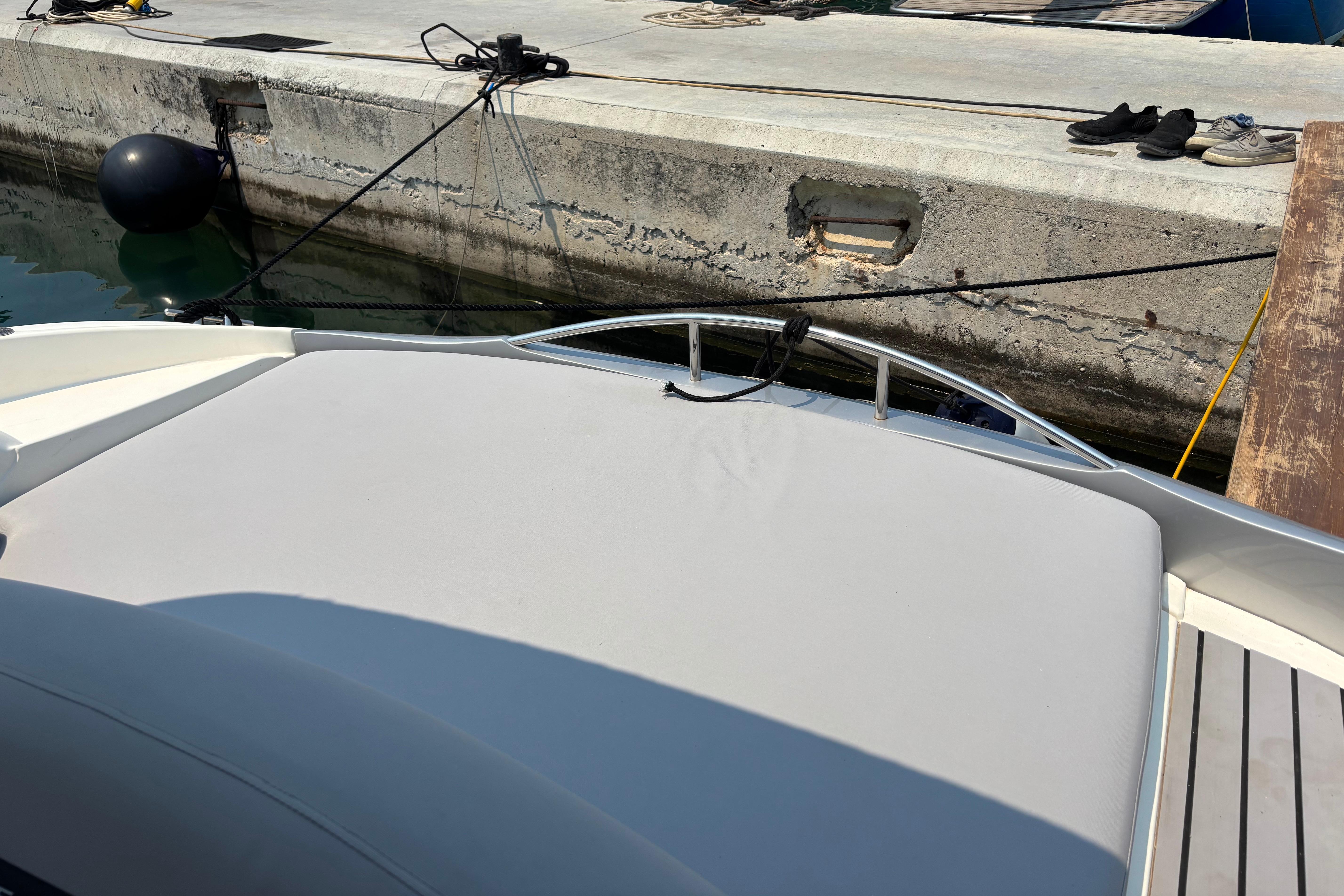 Mechanically, both engines and sterndrives have undergone a complete rebuild, with only 20 hours of operation since. A new 730L plastic fuel tank has been installed, along with new engine control levers, a new VHF radio, and an electric windlass with a dedicated battery. The yacht is also equipped with a bow thruster, ensuring smooth and effortless maneuvering.
