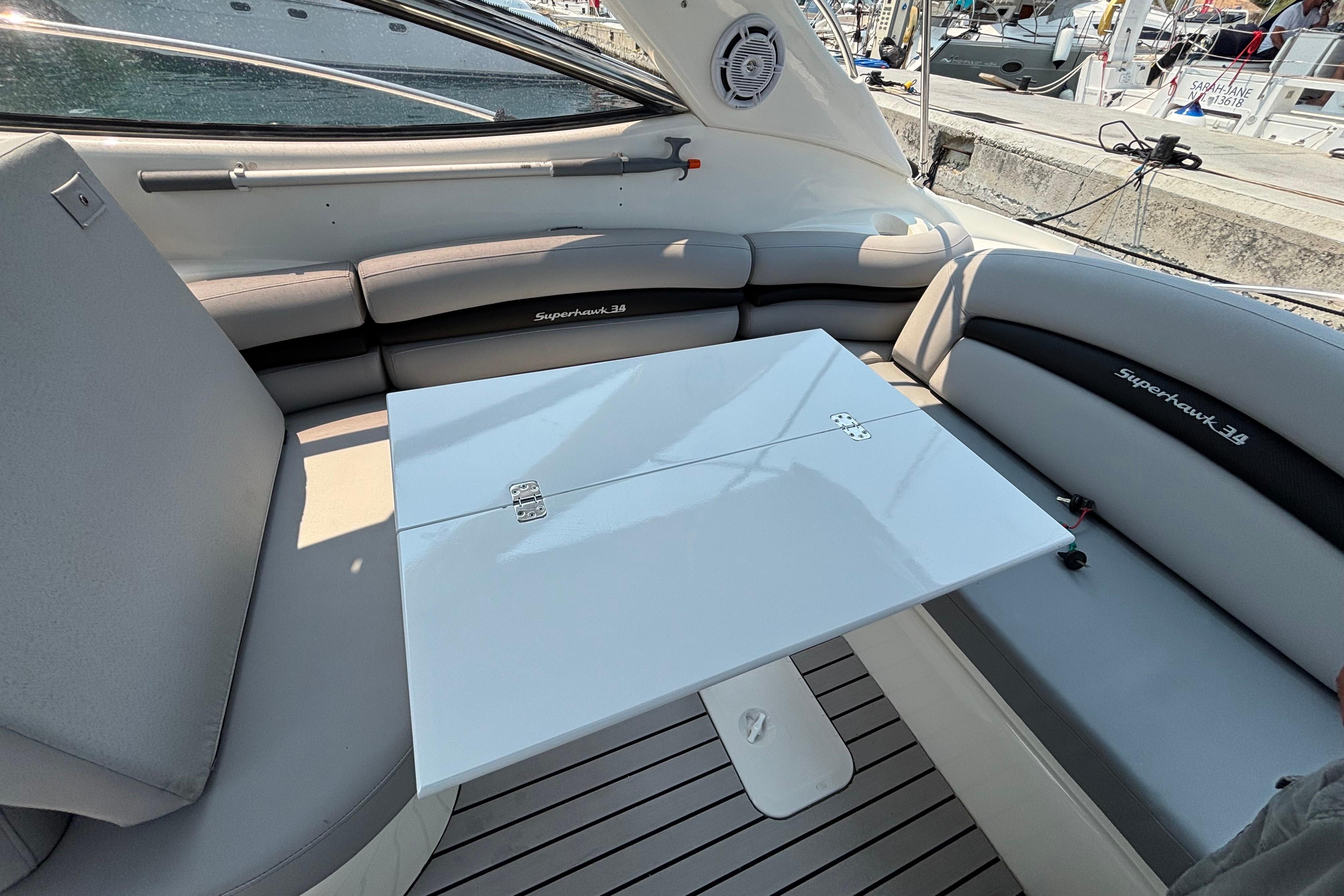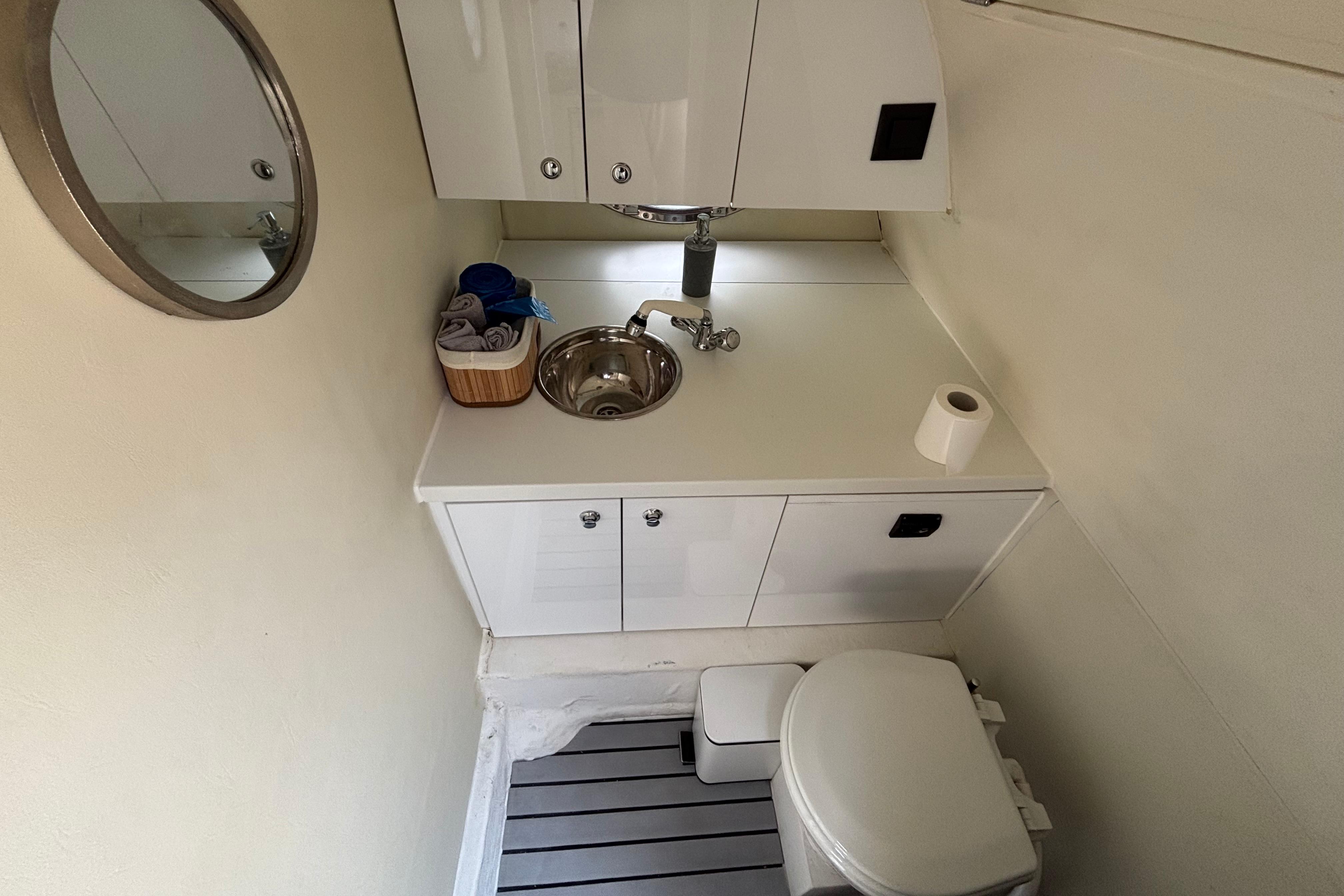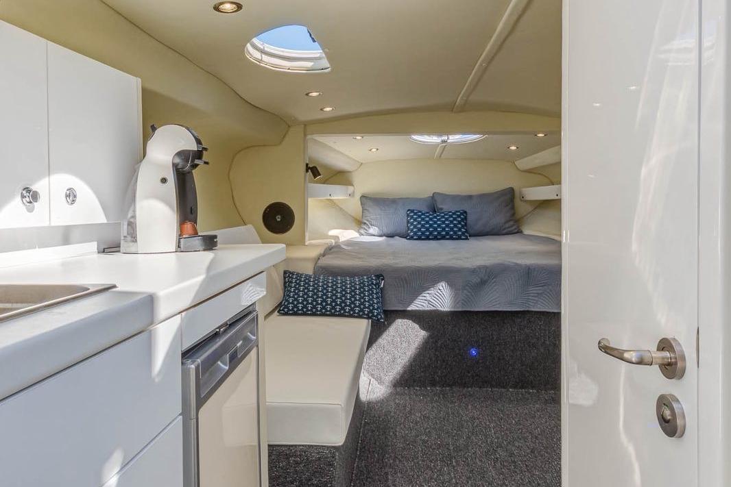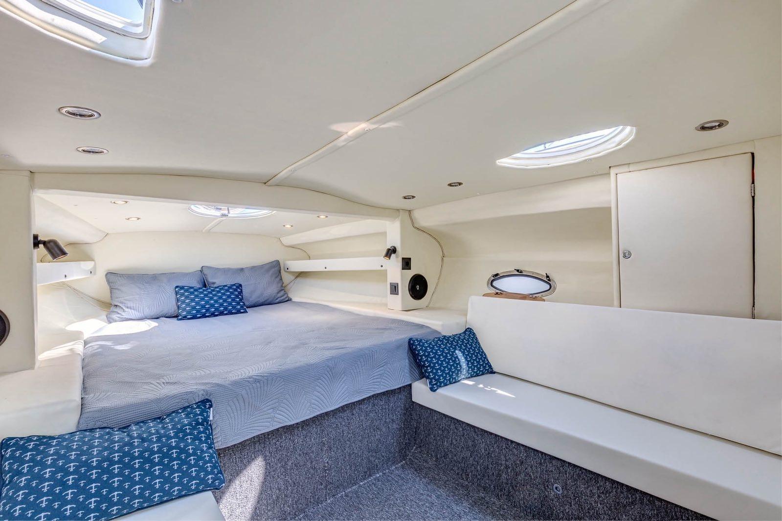 Mechanically, both engines and sterndrives have undergone a complete rebuild, with only 20 hours of operation since. A new 730L plastic fuel tank has been installed, along with new engine control levers, a new VHF radio, and an electric windlass with a dedicated battery. The yacht is also equipped with a bow thruster, ensuring smooth and effortless maneuvering.