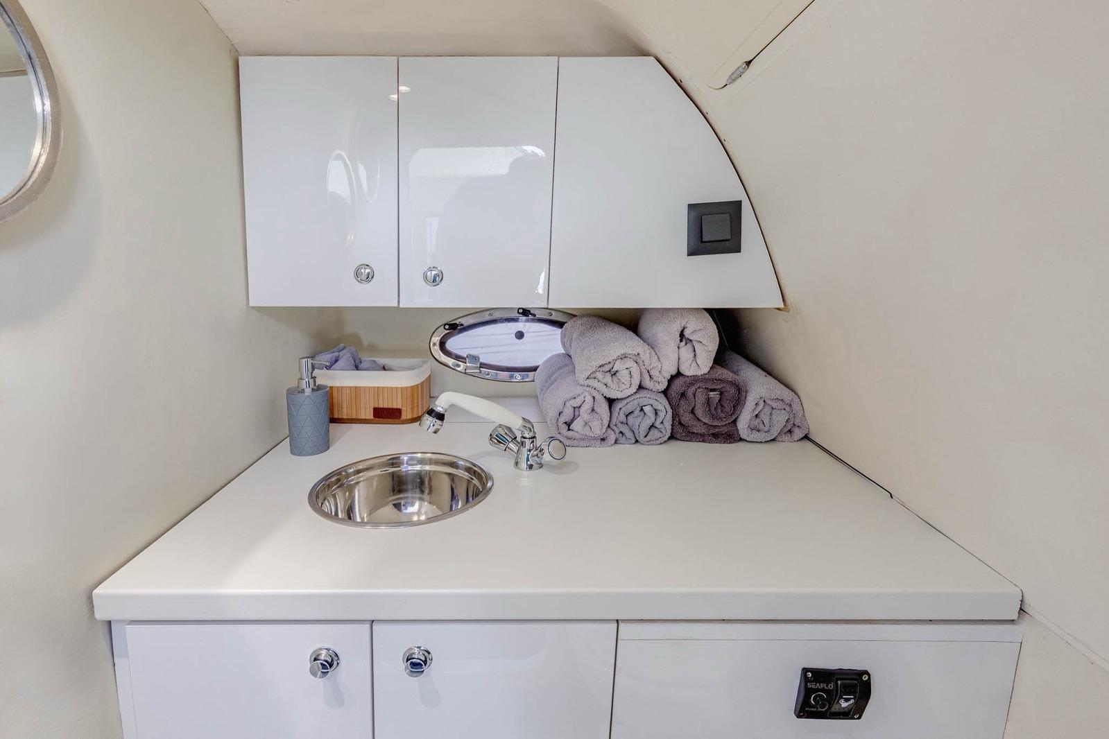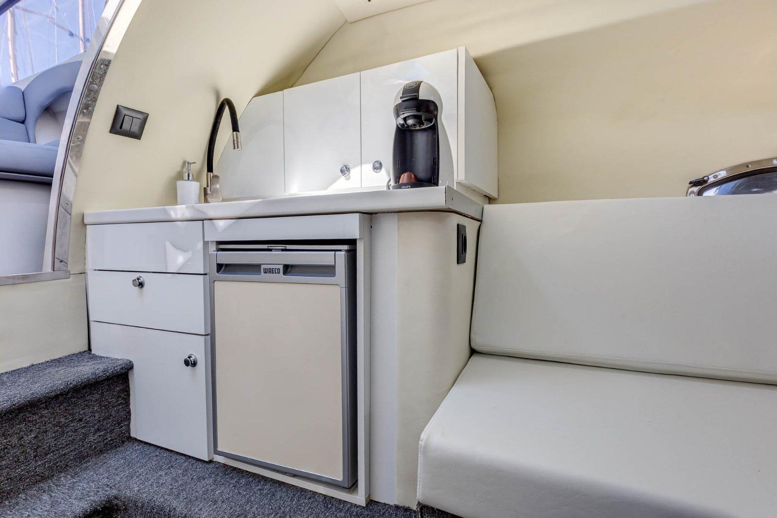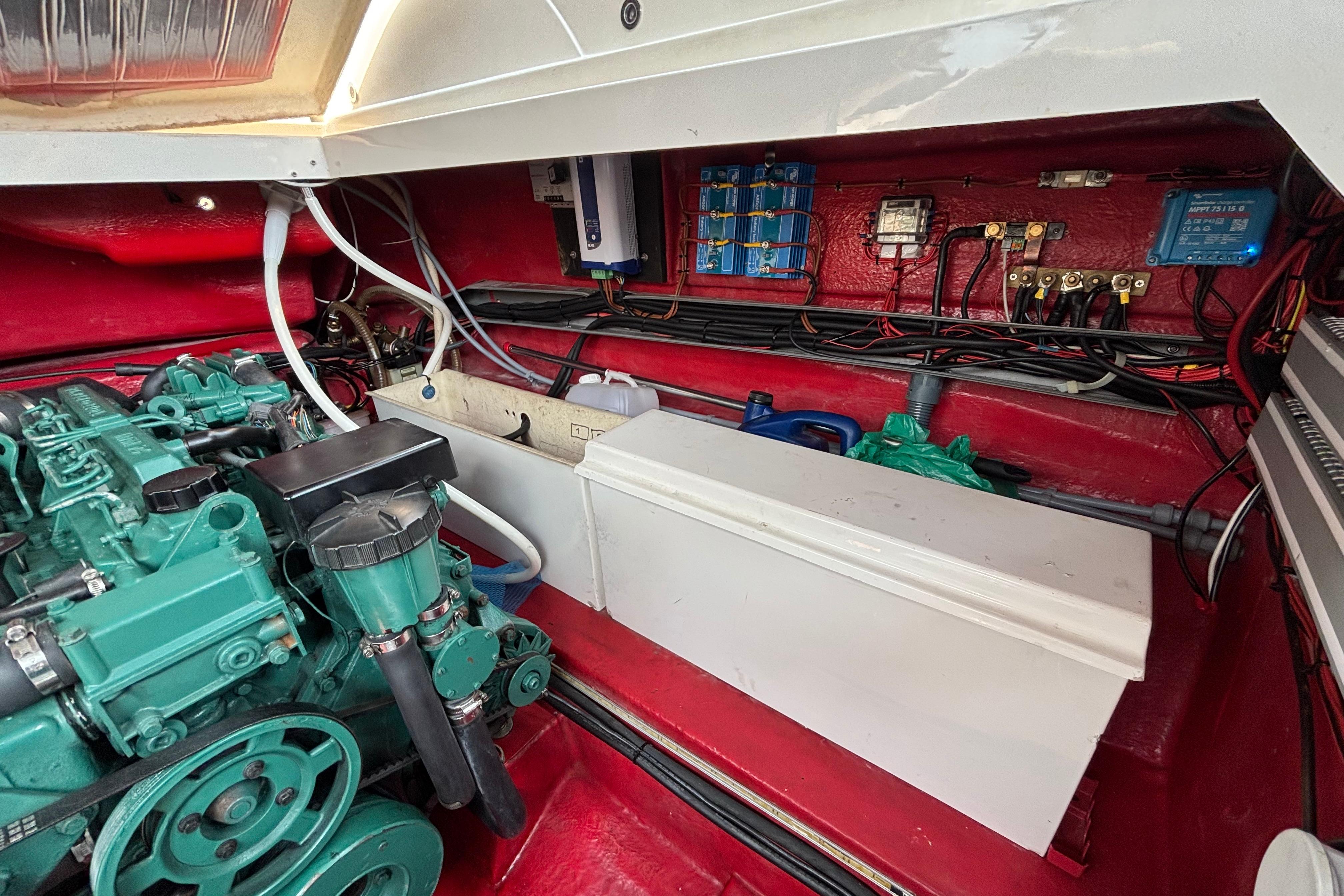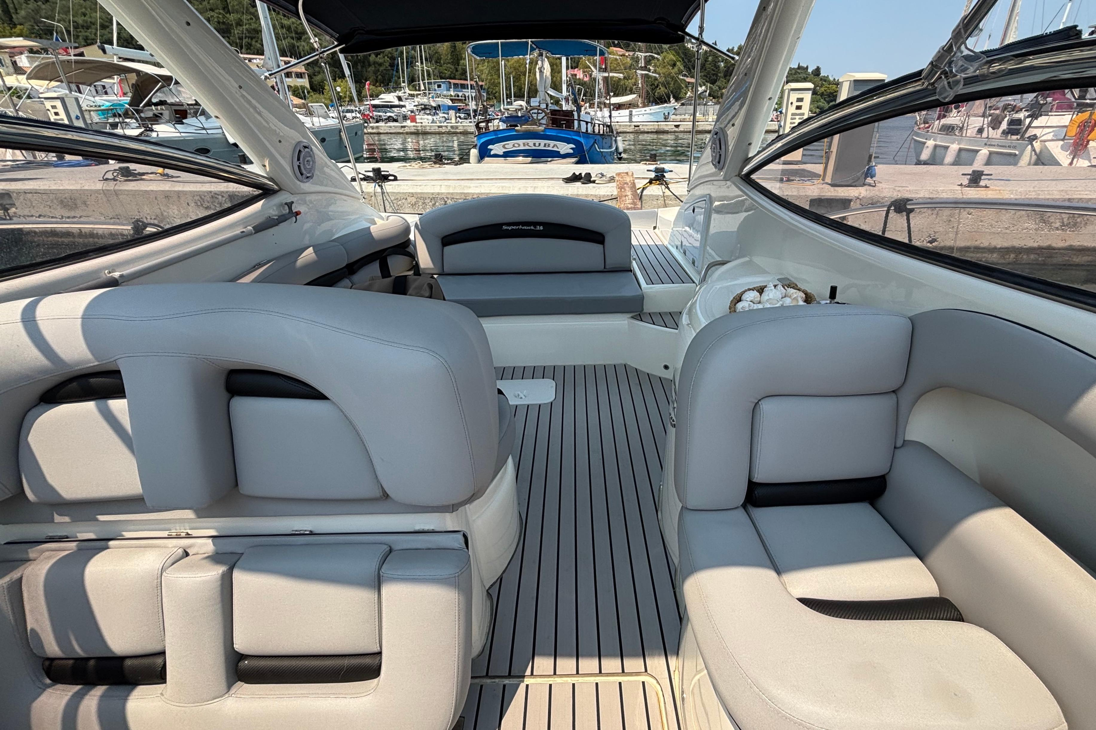 Mechanically, both engines and sterndrives have undergone a complete rebuild, with only 20 hours of operation since. A new 730L plastic fuel tank has been installed, along with new engine control levers, a new VHF radio, and an electric windlass with a dedicated battery. The yacht is also equipped with a bow thruster, ensuring smooth and effortless maneuvering.